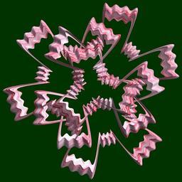 | Keywords: mathematica 3d cg parametricplot3d texture torus 輪環 りんかん ドーナツ どーなつ 五芒星 ごぼうせい 五光星 ごこうせい 五稜星 ごりょうせい code program algorithm コード プログラム アルゴリズム pentagram geometric sculpture geometricsculpture shape geometry sculpture mapping テクスチャ マッピング 模様 もよう abstract 抽象 ちゅうしょう アブストラクト design pattern デザイン パターン graphic グラフィック グラフィクス structure 意匠 構造 symmetry 対称性 たいしょうせい シンメトリー 対称 たいしょう algorithm コード plant blossom flower outdoor a = 3; (* center hole size of a torus *) b = 5; (* penta-torus *) c = 1; (* distance from the center of rotation *) d = 3; (* number of torus *) h = 1; (* height of a torus *) SetOptions[ParametricPlot3D, PlotRange -> Full, Mesh -> None, Boxed -> False, Axes -> False, PlotPoints -> 300, ImageSize -> 2600, Background -> Darker[Green, 0.8], PlotStyle -> Directive[Specularity[White, 30], Texture[Import["D:/tmp/86.jpg"]]], TextureCoordinateFunction -> ({#4, #5 } &), Lighting -> "Neutral"]; f[v_] := Cos[2 Cos[Cos[Cos[v]]]]; g[v_] := Sum[Sin[(2 k - 1) v]/(2 k - 1), {k, 4}]; x = (a - f[t] - g[b s]) Cos[s + 3 Pi/(4 b)] + c; y = (a - f[t] - g[b s]) Sin[s + 3 Pi/(4 b)] + c; z = (a - Sin[t] - h g[b s]); rot = Table[{x, y, z}.RotationMatrix[2 i Pi/d, {0, 0, 1}], {i, d}]; ParametricPlot3D[rot, {t, 0, 2 Pi}, {s, 0, 2 Pi}] (*--- The Texture *) a = 3; (* center hole size of a torus *) b = 5; (* penta-torus *) c = 1; (* distance from the center of rotation *) d = 3; (* number of torus *) h = 1; (* height of a torus *) SetOptions[ParametricPlot3D, PlotRange -> Full, Mesh -> None, Boxed -> False, Axes -> False, PlotPoints -> 300, ImageSize -> 2600, Background -> Darker[Green, 0.8], PlotStyle -> Directive[Specularity[White, 30], Texture[Import["D:/tmp/86.jpg"]]], TextureCoordinateFunction -> ({#4, #5 } &), Lighting -> "Neutral"]; f[v_] := Cos[2 Cos[Cos[Cos[v]]]]; g[v_] := Sum[Sin[(2 k - 1) v]/(2 k - 1), {k, 4}]; x = (a - f[t] - g[b s]) Cos[s + 3 Pi/(4 b)] + c; y = (a - f[t] - g[b s]) Sin[s + 3 Pi/(4 b)] + c; z = (a - Sin[t] - h g[b s]); rot = Table[{x, y, z}.RotationMatrix[2 i Pi/d, {0, 0, 1}], {i, d}]; ParametricPlot3D[rot, {t, 0, 2 Pi}, {s, 0, 2 Pi}] (*--- The Texture *) |