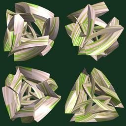 | Keywords: mathematica 3d cg parametricplot3d texture torus code program algorithm tri-torus tritorus プログラム コード アルゴリズム 輪環 りんかん ドーナツ どーなつ 四芒星 しぼうせい geometric sculpture geometricsculpture shape geometry sculpture mapping テクスチャ マッピング 模様 もよう abstract 抽象 ちゅうしょう アブストラクト design pattern デザイン パターン graphic グラフィック グラフィクス structure 意匠 構造 symmetry 対称性 たいしょうせい シンメトリー 対称 たいしょう outdoor photo border a = 2; (* center hole size *) b = 4; (* tetra-torus *) c = 4; (* distance from the center of rotation *) d = 3; (* number of torus *) h = 2; (* height of a torus *) SetOptions[ParametricPlot3D, PlotRange -> Full, Mesh -> None, Boxed -> False, Axes -> False, PlotPoints -> 300, ImageSize -> 1600, Background -> RGBColor[{20, 50, 30}/255], PlotStyle -> Directive[Specularity[White, 70], Texture[Import["D:/tmp/862.jpg"]]], TextureCoordinateFunction -> ({#4 + #5, #5 / Pi} &), Lighting -> "Neutral"]; f[v_] := TriangleWave[{-1, 1}, v/(2 Pi)]; g[v_] := TriangleWave[{-1, 1}, v/(2 Pi) + 1/4]; x = (a - g[t] - f[b s]) Cos[s] + c; y = (a - g[t] - f[b s]) Sin[s] + c; z = (a - f[t] - h f[b s]); rm = Table[{x, y, z}.RotationMatrix[2 i Pi/d, {1, 1, 1}], {i, d}]; ParametricPlot3D[rm, {t, 0, 2 Pi}, {s, 0, 2 Pi}] (*--- The Texture *) a = 2; (* center hole size *) b = 4; (* tetra-torus *) c = 4; (* distance from the center of rotation *) d = 3; (* number of torus *) h = 2; (* height of a torus *) SetOptions[ParametricPlot3D, PlotRange -> Full, Mesh -> None, Boxed -> False, Axes -> False, PlotPoints -> 300, ImageSize -> 1600, Background -> RGBColor[{20, 50, 30}/255], PlotStyle -> Directive[Specularity[White, 70], Texture[Import["D:/tmp/862.jpg"]]], TextureCoordinateFunction -> ({#4 + #5, #5 / Pi} &), Lighting -> "Neutral"]; f[v_] := TriangleWave[{-1, 1}, v/(2 Pi)]; g[v_] := TriangleWave[{-1, 1}, v/(2 Pi) + 1/4]; x = (a - g[t] - f[b s]) Cos[s] + c; y = (a - g[t] - f[b s]) Sin[s] + c; z = (a - f[t] - h f[b s]); rm = Table[{x, y, z}.RotationMatrix[2 i Pi/d, {1, 1, 1}], {i, d}]; ParametricPlot3D[rm, {t, 0, 2 Pi}, {s, 0, 2 Pi}] (*--- The Texture *) |