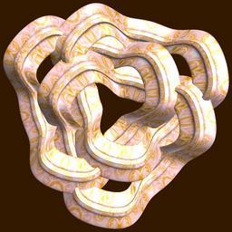 | Keywords: mathematica 3d cg parametricplot3d texture torus 輪環 りんかん ドーナツ どーなつ 三芒星 さんぼうせい 三光星 さんこうせい 三稜星 さんりょうせい code program algorithm コード プログラム アルゴリズム geometric sculpture geometricsculpture shape geometry sculpture mapping テクスチャ マッピング 模様 もよう abstract 抽象 ちゅうしょう アブストラクト design pattern デザイン パターン graphic グラフィック グラフィクス structure 意匠 構造 symmetry 対称性 たいしょうせい シンメトリー 対称 たいしょう algorithm コード indoor black background animal surreal ancient photo border a = 6; (* center hole size of a torus *) b = 3; (* tri-torus *) c = 1.8; (* distance from the center of rotation *) d = 3; (* number of torus *) h = 1.2; (* height of a torus *) SetOptions[ParametricPlot3D, PlotRange -> Full, Mesh -> None, Boxed -> False, Axes -> False, PlotPoints -> 400, ImageSize -> 3000, Background -> Darker[Orange, 0.8], PlotStyle -> Directive[Specularity[White, 30], Texture[Import["D:/tmp/861.jpg"]]], TextureCoordinateFunction -> ({#4, #5 2 Pi} &), Lighting -> "Neutral"]; f[v_] := Sin[2 Sin[Sin[Sin[v]]]]; g[v_] := Sum[Cos[(2 k - 1) v]/(2 k - 1), {k, 4}]; x = (a - g[t] - f[b s]) Cos[s + 3 Pi/(4 b)] + c; y = (a - g[t] - f[b s]) Sin[s + 3 Pi/(4 b)] + c; z = (a - Sin[t] - h f[b s]); rot = Table[{x, y, z}.RotationMatrix[2 i Pi/d, {0, 0, 1}], {i, d}]; ParametricPlot3D[rot, {t, 0, 2 Pi}, {s, 0, 2 Pi}] (*--- The Texture *) a = 6; (* center hole size of a torus *) b = 3; (* tri-torus *) c = 1.8; (* distance from the center of rotation *) d = 3; (* number of torus *) h = 1.2; (* height of a torus *) SetOptions[ParametricPlot3D, PlotRange -> Full, Mesh -> None, Boxed -> False, Axes -> False, PlotPoints -> 400, ImageSize -> 3000, Background -> Darker[Orange, 0.8], PlotStyle -> Directive[Specularity[White, 30], Texture[Import["D:/tmp/861.jpg"]]], TextureCoordinateFunction -> ({#4, #5 2 Pi} &), Lighting -> "Neutral"]; f[v_] := Sin[2 Sin[Sin[Sin[v]]]]; g[v_] := Sum[Cos[(2 k - 1) v]/(2 k - 1), {k, 4}]; x = (a - g[t] - f[b s]) Cos[s + 3 Pi/(4 b)] + c; y = (a - g[t] - f[b s]) Sin[s + 3 Pi/(4 b)] + c; z = (a - Sin[t] - h f[b s]); rot = Table[{x, y, z}.RotationMatrix[2 i Pi/d, {0, 0, 1}], {i, d}]; ParametricPlot3D[rot, {t, 0, 2 Pi}, {s, 0, 2 Pi}] (*--- The Texture *) |