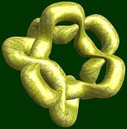 | Keywords: mathematica 3d cg parametricplot3d texture torus 輪環 りんかん ドーナツ どーなつ 三芒星 さんぼうせい 三光星 さんこうせい 三稜星 さんりょうせい code program algorithm コード プログラム アルゴリズム geometric sculpture geometricsculpture shape geometry sculpture mapping テクスチャ マッピング 模様 もよう abstract 抽象 ちゅうしょう アブストラクト design pattern デザイン パターン graphic グラフィック グラフィクス structure 意匠 構造 symmetry 対称性 たいしょうせい シンメトリー 対称 たいしょう algorithm コード black background indoor organic pattern a = 4; (* center hole size of a torus *) b = 3; (* tri-torus *) c = -2; (* distance from the center of rotation *) d = 3; (* number of torus *) h = 1; (* height of a torus *) SetOptions[ParametricPlot3D, PlotRange -> Full, Mesh -> None, Boxed -> False, Axes -> False, PlotPoints -> 400, ImageSize -> 3000, Background -> Darker[Green, 0.8], PlotStyle -> Directive[Specularity[White, 30], Texture[Import["D:/tmp/71.jpg"]]], TextureCoordinateFunction -> ({#4, #5 b Pi} &), Lighting -> "Neutral"]; f[v_] := Sin[2 Sin[Sin[Sin[v]]]]; x = (a - Cos[t] - f[b s]) Cos[s + Pi/b]; y = (a - Cos[t] - f[b s]) Sin[s + Pi/b]; z = (a - Sin[t] - h f[b s]) + c; rm = Table[{x, y, z}.RotationMatrix[2 i Pi/d, {1, 0, 0}], {i, d}]; ParametricPlot3D[rm, {t, 0, 2 Pi}, {s, 0, 2 Pi}] (*--- The Texture *) a = 4; (* center hole size of a torus *) b = 3; (* tri-torus *) c = -2; (* distance from the center of rotation *) d = 3; (* number of torus *) h = 1; (* height of a torus *) SetOptions[ParametricPlot3D, PlotRange -> Full, Mesh -> None, Boxed -> False, Axes -> False, PlotPoints -> 400, ImageSize -> 3000, Background -> Darker[Green, 0.8], PlotStyle -> Directive[Specularity[White, 30], Texture[Import["D:/tmp/71.jpg"]]], TextureCoordinateFunction -> ({#4, #5 b Pi} &), Lighting -> "Neutral"]; f[v_] := Sin[2 Sin[Sin[Sin[v]]]]; x = (a - Cos[t] - f[b s]) Cos[s + Pi/b]; y = (a - Cos[t] - f[b s]) Sin[s + Pi/b]; z = (a - Sin[t] - h f[b s]) + c; rm = Table[{x, y, z}.RotationMatrix[2 i Pi/d, {1, 0, 0}], {i, d}]; ParametricPlot3D[rm, {t, 0, 2 Pi}, {s, 0, 2 Pi}] (*--- The Texture *) |
