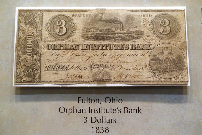 | Keywords: 3 Dollars, Orphan Institute's Bank, Fulton, Ohio, 1838 - National Museum of American History - DSC00198.jpg en Exhibit in the National Museum of American History Washington DC USA Photography was permitted in the museum without restriction 2015-03-27 11 29 44 own Daderot other versions cc-zero Banknotes in the National Museum of American History Local currencies of the United States | ||||