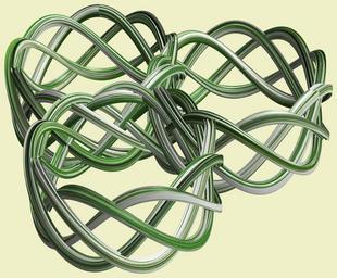 | Keywords: mathematica 3d cg parametricplot3d texture torus code program algorithm プログラム コード アルゴリズム 輪環 りんかん ドーナツ どーなつ トーラス とーらす knot 結び目 むすびめ mapping テクスチャ マッピング 模様 もよう design pattern デザイン パターン graphic グラフィック グラフィクス structure 意匠 構造 symmetry 対称性 たいしょうせい シンメトリー 対称 たいしょう indoor white background wheel drawing a = 16; (* center hole size of a torus *) b1 = 9;(* the number of angles *) b2 = 4;(* the number of waves *) b3 = 4; (* the number of knots *) c = 12; (* distance from the center of rotation *) d = 3; (* the number of tori *) h1 = 1; (* width of a torus *) h2 = 1; (* width of a torus *) h3 = 8; (* height of cross *) SetOptions[ParametricPlot3D, PlotRange -> Full, Mesh -> None, Boxed -> False, Axes -> None, PlotPoints -> 500, ImageSize -> 3000, Background -> RGBColor[{240, 240, 200}/255], PlotStyle -> Directive[Specularity[White, 50], Texture[Import["D:/tmp/911.jpg"]]], TextureCoordinateFunction -> ({#4, #5 /Pi} &), Lighting -> "Neutral"]; x = (a - h1 Cos[t] + h2 Sin[b1 s]) Cos[b3 s] + c; y = (a - h1 Cos[t] + h2 Sin[b1 s]) Sin[b3 s] + c; z = h3 Cos[b1 s] + Sin[b2 t] + c; rm = Table[{x, y, z}.RotationMatrix[2 i Pi/d, {0, 0, 1}], {i, d}]; ParametricPlot3D[rm, {t, 0, 2 Pi}, {s, 0, 2 Pi}] (*--- The Texture *) a = 16; (* center hole size of a torus *) b1 = 9;(* the number of angles *) b2 = 4;(* the number of waves *) b3 = 4; (* the number of knots *) c = 12; (* distance from the center of rotation *) d = 3; (* the number of tori *) h1 = 1; (* width of a torus *) h2 = 1; (* width of a torus *) h3 = 8; (* height of cross *) SetOptions[ParametricPlot3D, PlotRange -> Full, Mesh -> None, Boxed -> False, Axes -> None, PlotPoints -> 500, ImageSize -> 3000, Background -> RGBColor[{240, 240, 200}/255], PlotStyle -> Directive[Specularity[White, 50], Texture[Import["D:/tmp/911.jpg"]]], TextureCoordinateFunction -> ({#4, #5 /Pi} &), Lighting -> "Neutral"]; x = (a - h1 Cos[t] + h2 Sin[b1 s]) Cos[b3 s] + c; y = (a - h1 Cos[t] + h2 Sin[b1 s]) Sin[b3 s] + c; z = h3 Cos[b1 s] + Sin[b2 t] + c; rm = Table[{x, y, z}.RotationMatrix[2 i Pi/d, {0, 0, 1}], {i, d}]; ParametricPlot3D[rm, {t, 0, 2 Pi}, {s, 0, 2 Pi}] (*--- The Texture *) |