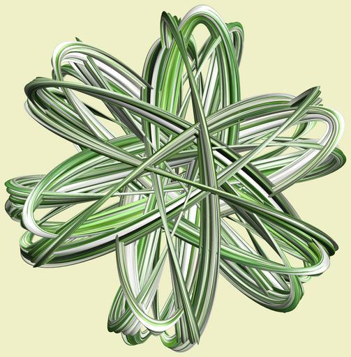 | Keywords: mathematica 3d cg parametricplot3d texture torus code program algorithm プログラム コード アルゴリズム 輪環 りんかん ドーナツ どーなつ トーラス とーらす knot 結び目 むすびめ mapping テクスチャ マッピング 模様 もよう design pattern デザイン パターン graphic グラフィック グラフィクス structure 意匠 構造 symmetry 対称性 たいしょうせい シンメトリー 対称 たいしょう white background drawing indoor illustration a = 6; (* center hole size of a torus *) b1 = 5;(* the number of angles *) b2 = 4;(* the number of waves *) b3 = 6; (* the number of knots *) c = 0; (* distance from the center of rotation *) d = 3; (* the number of tori *) h1 = 2; (* width of a torus *) h2 = 2; (* width of a torus *) h3 = 30; (* height of cross *) SetOptions[ParametricPlot3D, PlotRange -> Full, Mesh -> None, Boxed -> False, Axes -> None, PlotPoints -> 500, ImageSize -> 3000, Background -> RGBColor[{240, 240, 200}/255], PlotStyle -> Directive[Specularity[White, 50], Texture[Import["D:/tmp/911.jpg"]]], TextureCoordinateFunction -> ({#4, #5 /Pi} &), Lighting -> "Neutral"]; x = (a - h1 Cos[t] + h2 Sin[b1 s]) Cos[b3 s] + c; y = (a - h1 Cos[t] + h2 Sin[b1 s]) Sin[b3 s] + c; z = h3 Cos[b1 s] + Sin[b2 t] + c; rm = Table[{x, y, z}.RotationMatrix[2 i Pi/d, {1, 1, 0}], {i, d}]; ParametricPlot3D[rm, {t, 0, 2 Pi}, {s, 0, 2 Pi}] (*--- The Texture *) a = 6; (* center hole size of a torus *) b1 = 5;(* the number of angles *) b2 = 4;(* the number of waves *) b3 = 6; (* the number of knots *) c = 0; (* distance from the center of rotation *) d = 3; (* the number of tori *) h1 = 2; (* width of a torus *) h2 = 2; (* width of a torus *) h3 = 30; (* height of cross *) SetOptions[ParametricPlot3D, PlotRange -> Full, Mesh -> None, Boxed -> False, Axes -> None, PlotPoints -> 500, ImageSize -> 3000, Background -> RGBColor[{240, 240, 200}/255], PlotStyle -> Directive[Specularity[White, 50], Texture[Import["D:/tmp/911.jpg"]]], TextureCoordinateFunction -> ({#4, #5 /Pi} &), Lighting -> "Neutral"]; x = (a - h1 Cos[t] + h2 Sin[b1 s]) Cos[b3 s] + c; y = (a - h1 Cos[t] + h2 Sin[b1 s]) Sin[b3 s] + c; z = h3 Cos[b1 s] + Sin[b2 t] + c; rm = Table[{x, y, z}.RotationMatrix[2 i Pi/d, {1, 1, 0}], {i, d}]; ParametricPlot3D[rm, {t, 0, 2 Pi}, {s, 0, 2 Pi}] (*--- The Texture *) |
