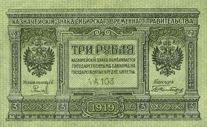 Keywords: 3 rub Kolchak.jpg п авительством Колчака аве с И кутский областной к аеведческий музей Российское п авительство 1919 PD-Old-70 currency Banknotes of Siberian Provisional Government Green banknotes Banknotes with a face value of 3 Banknotes of Russia 1919 |
