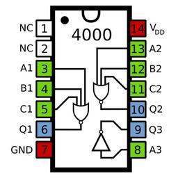 Keywords: 4000 Pinout.svg en The pinout of the 4000 dual 3-input NOR gate and inverter own Inductiveload 2009-03-02 IC pinout diagrams