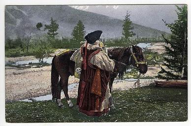 View Original:40._Женщина_алтайка_в_национальном_костюме_(головной_убор_-_куараан_борук,_овчинная_шуба_-_тон,_безрукавка_-_чегедек_-_одежда_замужней_женщины)_с_лошадью.jpg (800x528)