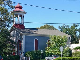 | Keywords: 417 Lafayette Onion Presby CMHD.jpg en Cape Island Presbyterian Church 1853 At 417 Lafayette Street now used as a theater Built 1853 Wooden construction with an onion-style cupola 1st of 2 churches built by the congregation In Cape May Historic District a US Historic Landmark District in Cape May city Cape May County New Jersey 2011-08-30 own Smallbones cc-zero Uploaded_with_UploadWizard Cape_May_Historic_District Churches in Cape May County New Jersey | ||||