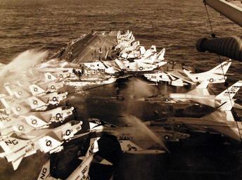 | Keywords: 428-GX-USN-1140830: Pacific Ocean. Sprinkler systems operate on the forward part of the flight deck of USS Enterprise (CVN 65) during a fire which broke out as the ship was conducting air operations 75 miles south of Pearl Harbor. Photographed by PH2 Lawrence T. Henderson, January 14, 1969. Official U.S. Navy photograph, now in the collections of the National Archives. (2016/07/26). 428-GX-USN-1140830: Pacific Ocean. Sprinkler systems operate on the forward part of the flight deck of USS Enterprise (CVN 65) during a fire which broke out as the ship was conducting air operations 75 miles south of Pearl Harbor. Photographed by PH2 Lawrence T. Henderson, January 14, 1969. Official U.S. Navy photograph, now in the collections of the National Archives. (2016/07/26). |