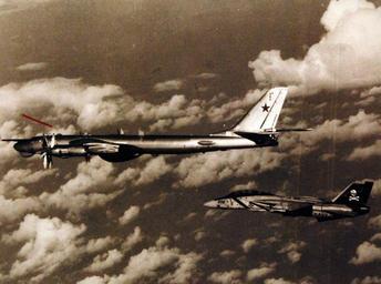 | Keywords: 428-GX-USN 1179034: North Atlantic. A Soviet TU-95 “Bear” long-range reconnaissance aircraft is escorted by an F-14 “Tomcat” fighter during NATO Exercise Teamwork 80. The “Tomcat” is from Fighter Squadron 84 embarked on USS Nimitz (CVN 68). Photographed received September 1980. Official U.S. Navy photograph, now in the collections of the National Archives. (2016/07/19). 428-GX-USN 1179034: North Atlantic. A Soviet TU-95 “Bear” long-range reconnaissance aircraft is escorted by an F-14 “Tomcat” fighter during NATO Exercise Teamwork 80. The “Tomcat” is from Fighter Squadron 84 embarked on USS Nimitz (CVN 68). Photographed received September 1980. Official U.S. Navy photograph, now in the collections of the National Archives. (2016/07/19). |