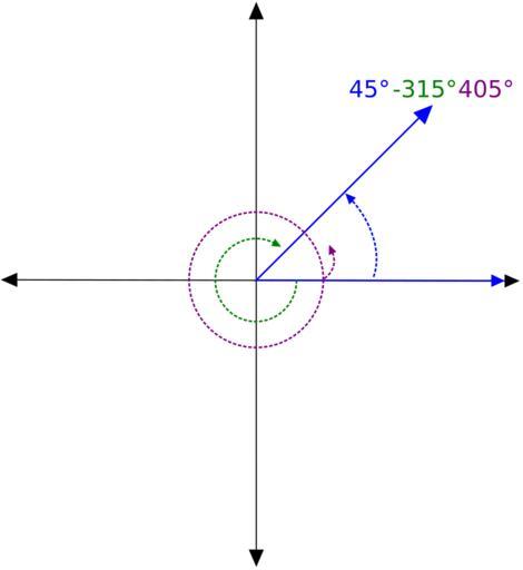 | Keywords: 45, -315, and 405 co-terminal angles.svg en 45° ˆ’315° and 405° angles which are all co-terminal own Adrignola 2010-12-02 High School Trigonometry Adjacent angles 45° rotation Reflex angles Angles greater than 360° Rotation Euclidean plane |