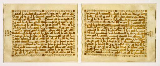 | Keywords: 4.8-17-1990-Guld-koranside-recto-og-verso.jpg The leaves from this magnificent Koran written in gold and contoured with brown ink have a horizontal format This is admirably suited to classical Kufi calligraphy which became common under the early Abbasid caliphs The length of the up and down strokes is limited while there is a tendency to a horizontal prolongation Vowels are indicated with colored dots and consonant signs are found in the form of little oblique strokes There are different kinds of markers for each verse each fifth verse and each tenth verse The vase-like ornament in the margin is purely decorative The designation Kufi comes from the Iraqi city of Kufa where this script was erroneously believed to have originated First Page Shora52-53 وَكَذَٰلِكَ أَوْحَيْنَا إِلَيْكَ رُوحًا مِّنْ أَمْرِنَا ۚ مَا كُنتَ تَدْرِي مَا الْكِتَابُ وَلَا الْإِيمَانُ وَلَٰكِن جَعَلْنَاهُ نُورًا نَّهْدِي بِهِ مَن نَّشَاءُ مِنْ عِبَادِنَا ۚ وَإِنَّكَ لَتَهْدِي إِلَىٰ صِرَاطٍ مُّسْتَقِيمٍ 52 And thus We have revealed to you an inspiration of Our command You did not know what is the Book or what is faith but We have made it a light by which We guide whom We will of Our servants And indeed O Muhammad you guide to a straight path - صِرَاطِ اللَّهِ الَّذِي لَهُ مَا فِي السَّمَاوَاتِ وَمَا فِي الْأَرْضِ ۗ أَلَا إِلَى اللَّهِ تَصِيرُ الْأُمُورُ 53 The path of Allah to whom belongs whatever is in the heavens and whatever is on the earth Unquestionably to Allah do all matters evolve ---- Az-Zukhruf The Gold Adornment حم 1 Ha Meem وَالْكِتَابِ الْمُبِينِ 2 By the clear Book إِنَّا جَعَلْنَاهُ قُرْآنًا عَرَبِيًّا لَّعَلَّكُمْ تَعْقِلُونَ 3 Indeed We have made it an Arabic Qur'an that you might understand وَإِنَّهُ فِي أُمِّ الْكِتَابِ لَدَيْنَا لَعَلِيٌّ حَكِيمٌ 4 And indeed it is in the Mother of the Book with Us exalted and full of wisdom أَفَنَضْرِبُ عَنكُمُ الذِّكْرَ صَفْحًا أَن كُنتُمْ قَوْمًا مُّسْرِفِينَ 5 Then should We turn the message away disregarding you because you are a transgressing people وَكَمْ أَرْسَلْنَا مِن نَّبِيٍّ فِي الْأَوَّلِينَ 6 And how many a prophet We sent among the former peoples وَمَا يَأْتِيهِم مِّن نَّبِيٍّ إِلَّا كَانُوا بِهِ يَسْتَهْزِئُونَ 7 But there would not come to them a prophet except that they used to ridicule him فَأَهْلَكْنَا أَشَدَّ مِنْهُم بَطْشًا وَمَضَىٰ مَثَلُ الْأَوَّلِينَ 8 And We destroyed greater than them in striking power and the example of the former peoples has preceded وَلَئِن سَأَلْتَهُم مَّنْ خَلَقَ السَّمَاوَاتِ وَالْأَرْضَ لَيَقُولُنَّ خَلَقَهُنَّ الْعَزِيزُ الْعَلِيمُ 9 And if you should ask them Who has created the heavens and the earth they would surely say They were created by the Exalted in Might the Knowing الَّذِي جَعَلَ لَكُمُ الْأَرْضَ مَهْدًا وَجَعَلَ لَكُمْ فِيهَا سُبُلًا لَّعَلَّكُمْ تَهْتَدُونَ 10 The one who has made for you the earth a bed and made for you upon it roads that you might be guided Second Page Shora 11-15 فَاطِرُ السَّمَاوَاتِ وَالْأَرْضِ ۚ جَعَلَ لَكُم مِّنْ أَنفُسِكُمْ أَزْوَاجًا وَمِنَ الْأَنْعَامِ أَزْوَاجًا ۖ يَذْرَؤُكُمْ فِيهِ ۚ لَيْسَ كَمِثْلِهِ شَيْءٌ ۖ وَهُوَ السَّمِيعُ الْبَصِيرُ 11 He is Creator of the heavens and the earth He has made for you from yourselves mates and among the cattle mates; He multiplies you thereby There is nothing like unto Him and He is the Hearing the Seeing لَهُ مَقَالِيدُ السَّمَاوَاتِ وَالْأَرْضِ ۖ يَبْسُطُ الرِّزْقَ لِمَن يَشَاءُ وَيَقْدِرُ ۚ إِنَّهُ بِكُلِّ شَيْءٍ عَلِيمٌ 12 To Him belong the keys of the heavens and the earth He extends provision for whom He wills and restricts it Indeed He is of all things Knowing شَرَعَ لَكُم مِّنَ الدِّينِ مَا وَصَّىٰ بِهِ نُوحًا وَالَّذِي أَوْحَيْنَا إِلَيْكَ وَمَا وَصَّيْنَا بِهِ إِبْرَاهِيمَ وَمُوسَىٰ وَعِيسَىٰ ۖ أَنْ أَقِيمُوا الدِّينَ وَلَا تَتَفَرَّقُوا فِيهِ ۚ كَبُرَ عَلَى الْمُشْرِكِينَ مَا تَدْعُوهُمْ إِلَيْهِ ۚ اللَّهُ يَجْتَبِي إِلَيْهِ مَن يَشَاءُ وَيَهْدِي إِلَيْهِ مَن يُنِيبُ 13 He has ordained for you of religion what He enjoined upon Noah and that which We have revealed to you O Muhammad and what We enjoined upon Abraham and Moses and Jesus - to establish the religion and not be divided therein Difficult for those who associate others with Allah is that to which you invite them Allah chooses for Himself whom He wills and guides to Himself whoever turns back to Him وَمَا تَفَرَّقُوا إِلَّا مِن بَعْدِ مَا جَاءَهُمُ الْعِلْمُ بَغْيًا بَيْنَهُمْ ۚ وَلَوْلَا كَلِمَةٌ سَبَقَتْ مِن رَّبِّكَ إِلَىٰ أَجَلٍ مُّسَمًّى لَّقُضِيَ بَيْ
