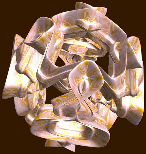 Keywords: mathematica 3d cg parametricplot3d texture torus 輪環 りんかん ドーナツ どーなつ 六芒星 ろくぼうせい 六光星 ろくこうせい 六稜星 ろくりょうせい code program algorithm コード プログラム アルゴリズム hexagram geometric sculpture geometricsculpture shape geometry sculpture mapping テクスチャ マッピング 模様 もよう abstract 抽象 ちゅうしょう アブストラクト design pattern デザイン パターン graphic グラフィック グラフィクス structure 意匠 構造 symmetry 対称性 たいしょうせい シンメトリー 対称 たいしょう algorithm コード black background indoor photo border a = 4; (* center hole size of a torus *) b = 6; (* hexa-torus *) c = -7; (* distance from the center of rotation *) d = 4; (* number of torus *) h = 1; (* height of a torus *) SetOptions[ParametricPlot3D, PlotRange -> Full, Mesh -> None, Boxed -> False, Axes -> False, PlotPoints -> 400, ImageSize -> 3000, Background -> Darker[Orange, 0.8], PlotStyle -> Directive[Specularity[White, 30], Texture[Import["D:/tmp/861.jpg"]]], TextureCoordinateFunction -> ({#4, #5 2 Pi} &), Lighting -> "Neutral"]; f[v_] := Sin[2 Sin[Sin[Sin[v]]]]; g[v_] := Sum[Cos[(2 k - 1) v]/(2 k - 1), {k, 4}]; x = (a - g[t] - f[b s]) Cos[s + Pi/b]; y = (a - g[t] - f[b s]) Sin[s + Pi/b]; z = (a - Sin[t] - h f[b s]) + c; rot = Table[{x, y, z}.RotationMatrix[2 i Pi/d, {1, 1, 0}], {i, d}]; ParametricPlot3D[rot, {t, 0, 2 Pi}, {s, 0, 2 Pi}] (*--- The Texture *) a = 4; (* center hole size of a torus *) b = 6; (* hexa-torus *) c = -7; (* distance from the center of rotation *) d = 4; (* number of torus *) h = 1; (* height of a torus *) SetOptions[ParametricPlot3D, PlotRange -> Full, Mesh -> None, Boxed -> False, Axes -> False, PlotPoints -> 400, ImageSize -> 3000, Background -> Darker[Orange, 0.8], PlotStyle -> Directive[Specularity[White, 30], Texture[Import["D:/tmp/861.jpg"]]], TextureCoordinateFunction -> ({#4, #5 2 Pi} &), Lighting -> "Neutral"]; f[v_] := Sin[2 Sin[Sin[Sin[v]]]]; g[v_] := Sum[Cos[(2 k - 1) v]/(2 k - 1), {k, 4}]; x = (a - g[t] - f[b s]) Cos[s + Pi/b]; y = (a - g[t] - f[b s]) Sin[s + Pi/b]; z = (a - Sin[t] - h f[b s]) + c; rot = Table[{x, y, z}.RotationMatrix[2 i Pi/d, {1, 1, 0}], {i, d}]; ParametricPlot3D[rot, {t, 0, 2 Pi}, {s, 0, 2 Pi}] (*--- The Texture *) |