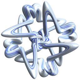 | Keywords: mathematica 3d cg parametricplot3d texture torus 輪環 りんかん ドーナツ どーなつ 六芒星 ろくぼうせい 六光星 六稜星 ろくこうせい ろくりょうせい program プログラム code コード algorithm コード アルゴリズム hexagram geometric sculpture geometricsculpture shape geometry sculpture mapping テクスチャ マッピング 模様 もよう design pattern デザイン パターン graphic グラフィック グラフィクス structure 意匠 構造 symmetry 対称性 たいしょうせい シンメトリー 対称 たいしょう algorithm white background SetOptions[ParametricPlot3D, PlotRange -> Full, Mesh -> None, Boxed -> False, Axes -> None, PlotPoints -> 400, ImageSize -> 3000, PlotStyle -> Directive[Specularity[White, 30], Texture[Import["D:/tmp/863.jpg"]]], TextureCoordinateFunction -> ({#4 + 2 #5, #5/Pi} &), Lighting -> "Neutral"]; a = 4; (* center hole size of a torus *) b = 6; (* hexa-torus *) c = 3; (* distance from the center of rotation *) d = 4; (* number of torus *) g[v_] := Sum[Cos[(2 k - 1) v]/(2 k - 1), {k, 4}]; x = (a - Cos[t] - Sin[b s]) g[s + Pi/(2 b)] + c; y = Sin[t] + c; z = (a - Cos[t] - Sin[b s]) Sin[s + Pi/(2 b)] + c; rot = Table[{x, y, z}.RotationMatrix[2 i Pi/d, {1, 1, 0}], {i, d}]; ParametricPlot3D[rot, {t, 0, 2 Pi}, {s, 0, 2 Pi}] (*--- The Texture The g[] is a 4-partial sum of the Fourier series for Square wave. g[]は矩形波のフーリエ展開の最初の4項 *) SetOptions[ParametricPlot3D, PlotRange -> Full, Mesh -> None, Boxed -> False, Axes -> None, PlotPoints -> 400, ImageSize -> 3000, PlotStyle -> Directive[Specularity[White, 30], Texture[Import["D:/tmp/863.jpg"]]], TextureCoordinateFunction -> ({#4 + 2 #5, #5/Pi} &), Lighting -> "Neutral"]; a = 4; (* center hole size of a torus *) b = 6; (* hexa-torus *) c = 3; (* distance from the center of rotation *) d = 4; (* number of torus *) g[v_] := Sum[Cos[(2 k - 1) v]/(2 k - 1), {k, 4}]; x = (a - Cos[t] - Sin[b s]) g[s + Pi/(2 b)] + c; y = Sin[t] + c; z = (a - Cos[t] - Sin[b s]) Sin[s + Pi/(2 b)] + c; rot = Table[{x, y, z}.RotationMatrix[2 i Pi/d, {1, 1, 0}], {i, d}]; ParametricPlot3D[rot, {t, 0, 2 Pi}, {s, 0, 2 Pi}] (*--- The Texture The g[] is a 4-partial sum of the Fourier series for Square wave. g[]は矩形波のフーリエ展開の最初の4項 *) |