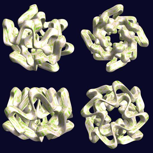 Keywords: mathematica 3d cg parametricplot3d texture torus 輪環 りんかん ドーナツ どーなつ 六芒星 ろくぼうせい 六光星 ろくこうせい 六稜星 ろくりょうせい code program algorithm コード プログラム アルゴリズム hexagram geometric sculpture geometricsculpture shape geometry sculpture mapping テクスチャ マッピング 模様 もよう abstract 抽象 ちゅうしょう アブストラクト design pattern デザイン パターン graphic グラフィック グラフィクス structure 意匠 構造 symmetry 対称性 たいしょうせい シンメトリー 対称 たいしょう algorithm コード black background indoor blossom plant a = 6; (* center hole size of a torus *) b = 6; (* hexa-torus *) c = 2; (* distance from the center of rotation *) d = 4; (* number of torus *) h = 2; (* height of a torus *) SetOptions[ParametricPlot3D, PlotRange -> Full, Mesh -> None, Boxed -> False, Axes -> False, PlotPoints -> 400, ImageSize -> 1600, Background -> RGBColor[{10, 10, 40}/255], PlotStyle -> Directive[Specularity[White, 30], Texture[Import["D:/tmp/864.jpg"]]], TextureCoordinateFunction -> ({#4, #5 2 Pi} &), Lighting -> "Neutral"]; f[v_] := Sin[2 Sin[Sin[Sin[v]]]]; x = (a - Cos[t] - Sin[b s]) Cos[s + Pi/(2 b)] + c; y = (a - Cos[t] - Sin[b s]) Sin[s + Pi/(2 b)] + c; z = (f[t] - h f[b s]) + c; rot = Table[{x, y, z}.RotationMatrix[2 i Pi/d, {0, 1, 1}], {i, d}]; ParametricPlot3D[rot, {t, 0, 2 Pi}, {s, 0, 2 Pi}] (*--- The Texture *) a = 6; (* center hole size of a torus *) b = 6; (* hexa-torus *) c = 2; (* distance from the center of rotation *) d = 4; (* number of torus *) h = 2; (* height of a torus *) SetOptions[ParametricPlot3D, PlotRange -> Full, Mesh -> None, Boxed -> False, Axes -> False, PlotPoints -> 400, ImageSize -> 1600, Background -> RGBColor[{10, 10, 40}/255], PlotStyle -> Directive[Specularity[White, 30], Texture[Import["D:/tmp/864.jpg"]]], TextureCoordinateFunction -> ({#4, #5 2 Pi} &), Lighting -> "Neutral"]; f[v_] := Sin[2 Sin[Sin[Sin[v]]]]; x = (a - Cos[t] - Sin[b s]) Cos[s + Pi/(2 b)] + c; y = (a - Cos[t] - Sin[b s]) Sin[s + Pi/(2 b)] + c; z = (f[t] - h f[b s]) + c; rot = Table[{x, y, z}.RotationMatrix[2 i Pi/d, {0, 1, 1}], {i, d}]; ParametricPlot3D[rot, {t, 0, 2 Pi}, {s, 0, 2 Pi}] (*--- The Texture *)