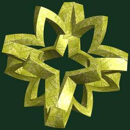 | Keywords: mathematica 3d cg parametricplot3d texture torus code program algorithm プログラム コード アルゴリズム 輪環 りんかん ドーナツ どーなつ 六芒星 ろくぼうせい geometric sculpture geometricsculpture shape geometry sculpture mapping テクスチャ マッピング 模様 もよう abstract 抽象 ちゅうしょう アブストラクト design pattern デザイン パターン graphic グラフィック グラフィクス structure 意匠 構造 symmetry 対称性 たいしょうせい シンメトリー 対称 たいしょう foliage leaf plant black background ancient a = 4; (* center hole size *) b = 6; (* hexa-torus *) c = 0; (* distance from the center of rotation *) d = 4; (* number of torus *) h = 1; (* height of a torus *) SetOptions[ParametricPlot3D, PlotRange -> Full, Mesh -> None, Boxed -> False, Axes -> False, PlotPoints -> 400, ImageSize -> 3000, Background -> RGBColor[{20, 50, 30}/255], PlotStyle -> Directive[Specularity[White, 30], Texture[Import["D:/tmp/71.jpg"]]], TextureCoordinateFunction -> ({#4, #5 Pi} &), Lighting -> "Neutral"]; f[v_] := TriangleWave[{-1, 1}, v/(2 Pi)]; g[v_] := TriangleWave[{-1, 1}, v/(2 Pi) + 1/4]; x = (a - g[t] - f[b s]) Cos[s]; y = (a - g[t] - f[b s]) Sin[s]; z = (a - f[t] - h f[b s]) + c; rm = Table[{x, y, z}.RotationMatrix[2 i Pi/d, {1, 1, 0}], {i, d}]; ParametricPlot3D[rm, {t, 0, 2 Pi}, {s, 0, Pi}] (*--- The Texture *) a = 4; (* center hole size *) b = 6; (* hexa-torus *) c = 0; (* distance from the center of rotation *) d = 4; (* number of torus *) h = 1; (* height of a torus *) SetOptions[ParametricPlot3D, PlotRange -> Full, Mesh -> None, Boxed -> False, Axes -> False, PlotPoints -> 400, ImageSize -> 3000, Background -> RGBColor[{20, 50, 30}/255], PlotStyle -> Directive[Specularity[White, 30], Texture[Import["D:/tmp/71.jpg"]]], TextureCoordinateFunction -> ({#4, #5 Pi} &), Lighting -> "Neutral"]; f[v_] := TriangleWave[{-1, 1}, v/(2 Pi)]; g[v_] := TriangleWave[{-1, 1}, v/(2 Pi) + 1/4]; x = (a - g[t] - f[b s]) Cos[s]; y = (a - g[t] - f[b s]) Sin[s]; z = (a - f[t] - h f[b s]) + c; rm = Table[{x, y, z}.RotationMatrix[2 i Pi/d, {1, 1, 0}], {i, d}]; ParametricPlot3D[rm, {t, 0, 2 Pi}, {s, 0, Pi}] (*--- The Texture *) |