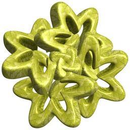 | Keywords: mathematica 3d cg parametricplot3d texture torus 輪環 りんかん ドーナツ どーなつ 六芒星 ろくぼうせい 六光星 ろくこうせい 六稜星 ろくりょうせい program プログラム code コード algorithm コード アルゴリズム hexagram geometric sculpture geometricsculpture shape geometry sculpture mapping テクスチャ マッピング 模様 もよう abstract 抽象 ちゅうしょう アブストラクト design pattern デザイン パターン graphic グラフィック グラフィクス structure 意匠 構造 symmetry 対称性 たいしょうせい シンメトリー 対称 たいしょう algorithm white background food indoor organic pattern a = 3;(* center hole size of a torus *) b = 6;(* hexa-torus *) c = 2.6;(* distance from the center of rotation *) d = 4;(* number of torus *) SetOptions[ParametricPlot3D, PlotRange -> Full, Mesh -> None, Boxed -> False, Axes -> None, PlotPoints -> 400, ImageSize -> 3000, PlotStyle -> Directive[Specularity[White, 50], Texture[Import["D:/tmp/71.jpg"]]], TextureCoordinateFunction -> ({#4, #5 b Pi} &), Lighting -> "Neutral"]; x = (a - Cos[t] - Sin[b s]) Cos[s + Pi/(2 b)] + c; y = Sin[2 Sin[Sin[Sin[t]]]] + c; z = (a - Cos[t] - Sin[b s]) Sin[s + Pi/(2 b)] + c; rot = Table[{x, y, z}.RotationMatrix[2 i Pi/d, {1, 2, 0}], {i, d}]; ParametricPlot3D[rot, {t, 0, 2 Pi}, {s, 0, 2 Pi}] (*--- The Texture *) a = 3;(* center hole size of a torus *) b = 6;(* hexa-torus *) c = 2.6;(* distance from the center of rotation *) d = 4;(* number of torus *) SetOptions[ParametricPlot3D, PlotRange -> Full, Mesh -> None, Boxed -> False, Axes -> None, PlotPoints -> 400, ImageSize -> 3000, PlotStyle -> Directive[Specularity[White, 50], Texture[Import["D:/tmp/71.jpg"]]], TextureCoordinateFunction -> ({#4, #5 b Pi} &), Lighting -> "Neutral"]; x = (a - Cos[t] - Sin[b s]) Cos[s + Pi/(2 b)] + c; y = Sin[2 Sin[Sin[Sin[t]]]] + c; z = (a - Cos[t] - Sin[b s]) Sin[s + Pi/(2 b)] + c; rot = Table[{x, y, z}.RotationMatrix[2 i Pi/d, {1, 2, 0}], {i, d}]; ParametricPlot3D[rot, {t, 0, 2 Pi}, {s, 0, 2 Pi}] (*--- The Texture *) |