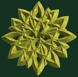 | Keywords: mathematica 3d cg parametricplot3d texture torus code program algorithm プログラム コード アルゴリズム 輪環 りんかん ドーナツ どーなつ 八芒星 はちぼうせい geometric sculpture geometricsculpture shape geometry sculpture mapping テクスチャ マッピング 模様 もよう abstract 抽象 ちゅうしょう アブストラクト design pattern デザイン パターン graphic グラフィック グラフィクス structure 意匠 構造 symmetry 対称性 たいしょうせい シンメトリー 対称 たいしょう organic pattern plant foliage outdoor tree black background leaf a = 3; (* center hole size *) b = 8; (* octa-torus *) c = 1; (* distance from the center of rotation *) d = 4; (* number of torus *) h = 0; (* height of a torus *) SetOptions[ParametricPlot3D, PlotRange -> Full, Mesh -> None, Boxed -> False, Axes -> False, PlotPoints -> 400, ImageSize -> 3000, Background -> RGBColor[{20, 50, 30}/255], PlotStyle -> Directive[Specularity[White, 30], Texture[Import["D:/tmp/71.jpg"]]], TextureCoordinateFunction -> ({#4, #5 Pi} &), Lighting -> "Neutral"]; f[v_] := TriangleWave[{-1, 1}, v/(2 Pi)]; g[v_] := TriangleWave[{-1, 1}, v/(2 Pi) + 1/4]; x = (a - g[t] - f[b s]) Cos[s] + c; y = (a - g[t] - f[b s]) Sin[s] + c; z = (a - f[t] - h f[b s]); rm = Table[{x, y, z}.RotationMatrix[2 i Pi/d, {0, 0, 1}], {i, d}]; ParametricPlot3D[rm, {t, 0, 2 Pi}, {s, 0, Pi}] (*--- The Texture *) a = 3; (* center hole size *) b = 8; (* octa-torus *) c = 1; (* distance from the center of rotation *) d = 4; (* number of torus *) h = 0; (* height of a torus *) SetOptions[ParametricPlot3D, PlotRange -> Full, Mesh -> None, Boxed -> False, Axes -> False, PlotPoints -> 400, ImageSize -> 3000, Background -> RGBColor[{20, 50, 30}/255], PlotStyle -> Directive[Specularity[White, 30], Texture[Import["D:/tmp/71.jpg"]]], TextureCoordinateFunction -> ({#4, #5 Pi} &), Lighting -> "Neutral"]; f[v_] := TriangleWave[{-1, 1}, v/(2 Pi)]; g[v_] := TriangleWave[{-1, 1}, v/(2 Pi) + 1/4]; x = (a - g[t] - f[b s]) Cos[s] + c; y = (a - g[t] - f[b s]) Sin[s] + c; z = (a - f[t] - h f[b s]); rm = Table[{x, y, z}.RotationMatrix[2 i Pi/d, {0, 0, 1}], {i, d}]; ParametricPlot3D[rm, {t, 0, 2 Pi}, {s, 0, Pi}] (*--- The Texture *) |