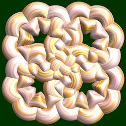 | Keywords: mathematica 3d cg parametricplot3d texture torus 輪環 りんかん ドーナツ どーなつ 八芒星 はちぼうせい 八光星 はちこうせい 八稜星 はちりょうせい program プログラム code コード algorithm コード アルゴリズム geometric sculpture geometricsculpture shape geometry sculpture mapping テクスチャ マッピング 模様 もよう abstract 抽象 ちゅうしょう アブストラクト design pattern デザイン パターン graphic グラフィック グラフィクス structure 意匠 構造 symmetry 対称性 たいしょうせい シンメトリー 対称 たいしょう algorithm bright SetOptions[ParametricPlot3D, PlotRange -> Full, Mesh -> None, Boxed -> False, Axes -> None, PlotPoints -> 300, ImageSize -> 3000, Background -> Darker[Green, 0.8], PlotStyle -> Directive[Specularity[White, 30], Texture[Import["D:/tmp/861.jpg"]]], TextureCoordinateFunction -> ({#4 + #5, #5/Pi} &), Lighting -> "Neutral"]; a = 3; (* center hole size of a torus *) b = 8; (* octa-torus *) c = 2.5; (* distance from the center of rotation *) d = 4; (* number of torus *) v = 3; x = (a - Cos[t] - Sin[b s]) Cos[v s] + c; y = Sin[t] Sin[b s] + c; z = (a - Cos[t] - Sin[b s]) Sin[v s] + c; rot = Table[{x, y, z}.RotationMatrix[2 i Pi/d, {0, 1, 0}], {i, d}]; ParametricPlot3D[rot, {t, 0, 2 Pi}, {s, 0, 2 Pi}] (*--- The Texture *) SetOptions[ParametricPlot3D, PlotRange -> Full, Mesh -> None, Boxed -> False, Axes -> None, PlotPoints -> 300, ImageSize -> 3000, Background -> Darker[Green, 0.8], PlotStyle -> Directive[Specularity[White, 30], Texture[Import["D:/tmp/861.jpg"]]], TextureCoordinateFunction -> ({#4 + #5, #5/Pi} &), Lighting -> "Neutral"]; a = 3; (* center hole size of a torus *) b = 8; (* octa-torus *) c = 2.5; (* distance from the center of rotation *) d = 4; (* number of torus *) v = 3; x = (a - Cos[t] - Sin[b s]) Cos[v s] + c; y = Sin[t] Sin[b s] + c; z = (a - Cos[t] - Sin[b s]) Sin[v s] + c; rot = Table[{x, y, z}.RotationMatrix[2 i Pi/d, {0, 1, 0}], {i, d}]; ParametricPlot3D[rot, {t, 0, 2 Pi}, {s, 0, 2 Pi}] (*--- The Texture *) |