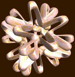 | Keywords: mathematica 3d cg parametricplot3d texture torus 輪環 りんかん ドーナツ どーなつ 八芒星 はちぼうせい 八光星 はちこうせい 八稜星 はちりょうせい code program algorithm コード プログラム アルゴリズム geometric sculpture geometricsculpture shape geometry sculpture mapping テクスチャ マッピング 模様 もよう abstract 抽象 ちゅうしょう アブストラクト design pattern デザイン パターン graphic グラフィック グラフィクス structure 意匠 構造 symmetry 対称性 たいしょうせい シンメトリー 対称 たいしょう algorithm コード black background pastel serene a = 5; (* center hole size of a torus *) b = 8; (* octa-torus *) c = -1; (* distance from the center of rotation *) d = 4; (* number of torus *) h = 2; (* height of a torus *) SetOptions[ParametricPlot3D, PlotRange -> Full, Mesh -> None, Boxed -> False, Axes -> False, PlotPoints -> 400, ImageSize -> 3000, Background -> Darker[Orange, 0.8], PlotStyle -> Directive[Specularity[White, 30], Texture[Import["D:/tmp/861.jpg"]]], TextureCoordinateFunction -> ({#4, #5 2 Pi} &), Lighting -> "Neutral"]; f[v_] := Sin[2 Sin[Sin[Sin[v]]]]; x = (a - Cos[t] - f[b s]) Cos[s + Pi/(2 b)]; y = (a - Cos[t] - f[b s]) Sin[s + Pi/(2 b)]; z = (a - Sin[t] - h f[b s]) + c; rm = Table[{x, y, z}.RotationMatrix[2 i Pi/d, {1, 0, 0}], {i, d}]; ParametricPlot3D[rm, {t, 0, 2 Pi}, {s, 0, 2 Pi}] (*--- The Texture *) a = 5; (* center hole size of a torus *) b = 8; (* octa-torus *) c = -1; (* distance from the center of rotation *) d = 4; (* number of torus *) h = 2; (* height of a torus *) SetOptions[ParametricPlot3D, PlotRange -> Full, Mesh -> None, Boxed -> False, Axes -> False, PlotPoints -> 400, ImageSize -> 3000, Background -> Darker[Orange, 0.8], PlotStyle -> Directive[Specularity[White, 30], Texture[Import["D:/tmp/861.jpg"]]], TextureCoordinateFunction -> ({#4, #5 2 Pi} &), Lighting -> "Neutral"]; f[v_] := Sin[2 Sin[Sin[Sin[v]]]]; x = (a - Cos[t] - f[b s]) Cos[s + Pi/(2 b)]; y = (a - Cos[t] - f[b s]) Sin[s + Pi/(2 b)]; z = (a - Sin[t] - h f[b s]) + c; rm = Table[{x, y, z}.RotationMatrix[2 i Pi/d, {1, 0, 0}], {i, d}]; ParametricPlot3D[rm, {t, 0, 2 Pi}, {s, 0, 2 Pi}] (*--- The Texture *) |