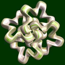 | Keywords: mathematica 3d cg parametricplot3d texture torus 輪環 りんかん ドーナツ どーなつ 五芒星 ごぼうせい 五光星 ごこうせい 五稜星 ごりょうせい プログラム コード code program algorithm コード アルゴリズム pentagram geometric sculpture geometricsculpture shape geometry sculpture mapping テクスチャ マッピング 模様 もよう design pattern デザイン パターン graphic グラフィック グラフィクス structure 意匠 構造 symmetry 対称性 たいしょうせい シンメトリー 対称 たいしょう algorithm indoor SetOptions[ParametricPlot3D, PlotRange -> Full, Mesh -> None, Boxed -> False, Axes -> None, PlotPoints -> 300, ImageSize -> 3000, Background -> Darker[Green, 0.8], PlotStyle -> Directive[Specularity[White, 30], Texture[Import["D:/tmp/862.jpg"]]], TextureCoordinateFunction -> ({#4 + #5, #5/Pi} &), Lighting -> "Neutral"]; a = 3; (* center hole size of a torus *) b = 5; (* penta-torus *) c = 3; (* distance from the center of rotation *) d = 4; (* number of torus *) f[v_] := Sin[2 Sin[Sin[Sin[v]]]]; x = (a - Cos[t] - f[b s]) Cos[s + Pi/(2 b)] + c; y = Sin[t] + c; z = (a - Cos[t] - f[b s]) Sin[s + Pi/(2 b)] + c; rot = Table[{x, y, z}.RotationMatrix[2 i Pi/d, {1, 2, 0}], {i, d}]; ParametricPlot3D[rot, {t, 0, 2 Pi}, {s, 0, 2 Pi}] (* --- The Texture *) SetOptions[ParametricPlot3D, PlotRange -> Full, Mesh -> None, Boxed -> False, Axes -> None, PlotPoints -> 300, ImageSize -> 3000, Background -> Darker[Green, 0.8], PlotStyle -> Directive[Specularity[White, 30], Texture[Import["D:/tmp/862.jpg"]]], TextureCoordinateFunction -> ({#4 + #5, #5/Pi} &), Lighting -> "Neutral"]; a = 3; (* center hole size of a torus *) b = 5; (* penta-torus *) c = 3; (* distance from the center of rotation *) d = 4; (* number of torus *) f[v_] := Sin[2 Sin[Sin[Sin[v]]]]; x = (a - Cos[t] - f[b s]) Cos[s + Pi/(2 b)] + c; y = Sin[t] + c; z = (a - Cos[t] - f[b s]) Sin[s + Pi/(2 b)] + c; rot = Table[{x, y, z}.RotationMatrix[2 i Pi/d, {1, 2, 0}], {i, d}]; ParametricPlot3D[rot, {t, 0, 2 Pi}, {s, 0, 2 Pi}] (* --- The Texture *) |