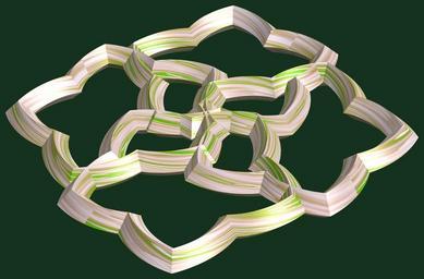 | Keywords: mathematica 3d cg parametricplot3d texture torus code program algorithm プログラム コード アルゴリズム 輪環 りんかん ドーナツ どーなつ 五芒星 ごぼうせい geometric sculpture geometricsculpture shape geometry sculpture mapping テクスチャ マッピング 模様 もよう abstract 抽象 ちゅうしょう アブストラクト design pattern デザイン パターン graphic グラフィック グラフィクス structure 意匠 構造 symmetry 対称性 たいしょうせい シンメトリー 対称 たいしょう black background indoor a = 6; (* center hole size *) b = 5; (* penta-torus *) c = 4; (* distance from the center of rotation *) d = 4; (* number of torus *) h = 0; (* height of a torus *) SetOptions[ParametricPlot3D, PlotRange -> Full, Mesh -> None, Boxed -> False, Axes -> False, PlotPoints -> 400, ImageSize -> 3000, Background -> RGBColor[{20, 50, 30}/255], PlotStyle -> Directive[Specularity[White, 70], Texture[Import["D:/tmp/862.jpg"]]], TextureCoordinateFunction -> ({#4 + #5, #5 / Pi} &), Lighting -> "Neutral"]; f[v_] := TriangleWave[{-1, 1}, v/(2 Pi)]; g[v_] := TriangleWave[{-1, 1}, v/(2 Pi) + 1/4]; x = (a - g[t] - f[b s]) Cos[s] + c; y = (a - g[t] - f[b s]) Sin[s] + c; z = (a - f[t] - h f[b s]); rm = Table[{x, y, z}.RotationMatrix[2 i Pi/d, {0, 0, 1}], {i, d}]; ParametricPlot3D[rm, {t, 0, 2 Pi}, {s, 0, Pi}] (*--- The Texture *) a = 6; (* center hole size *) b = 5; (* penta-torus *) c = 4; (* distance from the center of rotation *) d = 4; (* number of torus *) h = 0; (* height of a torus *) SetOptions[ParametricPlot3D, PlotRange -> Full, Mesh -> None, Boxed -> False, Axes -> False, PlotPoints -> 400, ImageSize -> 3000, Background -> RGBColor[{20, 50, 30}/255], PlotStyle -> Directive[Specularity[White, 70], Texture[Import["D:/tmp/862.jpg"]]], TextureCoordinateFunction -> ({#4 + #5, #5 / Pi} &), Lighting -> "Neutral"]; f[v_] := TriangleWave[{-1, 1}, v/(2 Pi)]; g[v_] := TriangleWave[{-1, 1}, v/(2 Pi) + 1/4]; x = (a - g[t] - f[b s]) Cos[s] + c; y = (a - g[t] - f[b s]) Sin[s] + c; z = (a - f[t] - h f[b s]); rm = Table[{x, y, z}.RotationMatrix[2 i Pi/d, {0, 0, 1}], {i, d}]; ParametricPlot3D[rm, {t, 0, 2 Pi}, {s, 0, Pi}] (*--- The Texture *) |