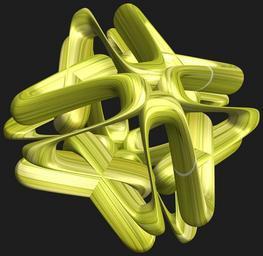 | Keywords: mathematica 3d cg parametricplot3d texture torus 輪環 りんかん ドーナツ どーなつ 四芒星 しぼうせい 四光星 しこうせい 四稜星 しりょうせい code program algorithm プログラム コード アルゴリズム bamboo 竹 たけ タケ geometric sculpture geometricsculpture shape geometry sculpture mapping テクスチャ マッピング 模様 もよう abstract 抽象 ちゅうしょう アブストラクト design pattern デザイン パターン graphic グラフィック グラフィクス structure 意匠 構造 symmetry 対称性 たいしょうせい シンメトリー 対称 たいしょう black background a = 3; (* center hole size of a torus *) b = 4; (* tetra-torus *) c = -7; (* distance from the center of rotation *) d = 4; (* number of torus *) h = 3; (* height of a torus *) SetOptions[ParametricPlot3D, PlotRange -> Full, Mesh -> None, Boxed -> False, Axes -> False, PlotPoints -> 400, ImageSize -> 3000, Background -> RGBColor[{30, 30, 30}/255], PlotStyle -> Directive[Specularity[White, 50], Texture[Import["D:/tmp/71.jpg"]]], TextureCoordinateFunction -> ({#4 + #5, #5/Pi} &), Lighting -> "Neutral"]; f[v_] := Sin[2 Sin[Sin[Sin[v]]]]; x = (a - Cos[t] - f[b s]) Cos[s + Pi/(2 b)]; y = (a - Cos[t] - f[b s]) Sin[s + Pi/(2 b)]; z = (a - Sin[t] - h f[b s]) + c; rm = Table[{x, y, z}.RotationMatrix[2 i Pi/d, {1, 0, 0}], {i, d}]; ParametricPlot3D[rm, {t, 0, 2 Pi}, {s, 0, 2 Pi}] (*--- The Texture *) a = 3; (* center hole size of a torus *) b = 4; (* tetra-torus *) c = -7; (* distance from the center of rotation *) d = 4; (* number of torus *) h = 3; (* height of a torus *) SetOptions[ParametricPlot3D, PlotRange -> Full, Mesh -> None, Boxed -> False, Axes -> False, PlotPoints -> 400, ImageSize -> 3000, Background -> RGBColor[{30, 30, 30}/255], PlotStyle -> Directive[Specularity[White, 50], Texture[Import["D:/tmp/71.jpg"]]], TextureCoordinateFunction -> ({#4 + #5, #5/Pi} &), Lighting -> "Neutral"]; f[v_] := Sin[2 Sin[Sin[Sin[v]]]]; x = (a - Cos[t] - f[b s]) Cos[s + Pi/(2 b)]; y = (a - Cos[t] - f[b s]) Sin[s + Pi/(2 b)]; z = (a - Sin[t] - h f[b s]) + c; rm = Table[{x, y, z}.RotationMatrix[2 i Pi/d, {1, 0, 0}], {i, d}]; ParametricPlot3D[rm, {t, 0, 2 Pi}, {s, 0, 2 Pi}] (*--- The Texture *) |