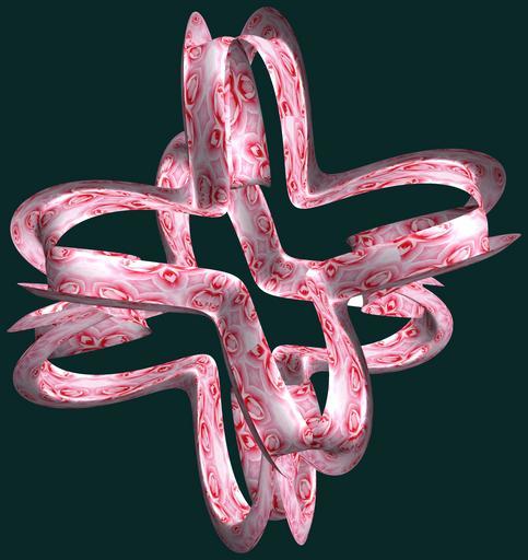 Keywords: mathematica 3d cg parametricplot3d texture torus 輪環 りんかん ドーナツ どーなつ 四芒星 しぼうせい 四光星 しこうせい 四稜星 しりょうせい code program algorithm コード プログラム アルゴリズム geometric sculpture geometricsculpture shape geometry sculpture mapping テクスチャ マッピング 模様 もよう abstract 抽象 ちゅうしょう アブストラクト design pattern デザイン パターン graphic グラフィック グラフィクス structure 意匠 構造 symmetry 対称性 たいしょうせい シンメトリー 対称 たいしょう algorithm コード people black background surreal a = 3; (* center hole size of a torus *) b = 4; (* tetra-torus *) c = 2; (* distance from the center of rotation *) d = 4; (* number of torus *) h = 1; (* height of a torus *) SetOptions[ParametricPlot3D, PlotRange -> Full, Mesh -> None, Boxed -> False, Axes -> False, PlotPoints -> 400, ImageSize -> 3000, Background -> RGBColor[{10, 40, 40}/255], PlotStyle -> Directive[Specularity[White, 30], Texture[Import["D:/tmp/86.jpg"]]], TextureCoordinateFunction -> ({#4, #5 2 Pi} &), Lighting -> "Neutral"]; f[v_] := Cos[2 Cos[Cos[Cos[v]]]]; x = (a - f[t] - Sin[b s]) Cos[s + Pi/(2 b)]; y = (a - f[t] - Sin[b s]) Sin[s + Pi/(2 b)]; z = (Sin[t/2] - h Sin[b s]) + c; rot = Table[{x, y, z}.RotationMatrix[2 i Pi/d, {1, 1, 0}], {i, d}]; ParametricPlot3D[rot, {t, 0, 2 Pi}, {s, 0, 2 Pi}] (*--- The Texture *) a = 3; (* center hole size of a torus *) b = 4; (* tetra-torus *) c = 2; (* distance from the center of rotation *) d = 4; (* number of torus *) h = 1; (* height of a torus *) SetOptions[ParametricPlot3D, PlotRange -> Full, Mesh -> None, Boxed -> False, Axes -> False, PlotPoints -> 400, ImageSize -> 3000, Background -> RGBColor[{10, 40, 40}/255], PlotStyle -> Directive[Specularity[White, 30], Texture[Import["D:/tmp/86.jpg"]]], TextureCoordinateFunction -> ({#4, #5 2 Pi} &), Lighting -> "Neutral"]; f[v_] := Cos[2 Cos[Cos[Cos[v]]]]; x = (a - f[t] - Sin[b s]) Cos[s + Pi/(2 b)]; y = (a - f[t] - Sin[b s]) Sin[s + Pi/(2 b)]; z = (Sin[t/2] - h Sin[b s]) + c; rot = Table[{x, y, z}.RotationMatrix[2 i Pi/d, {1, 1, 0}], {i, d}]; ParametricPlot3D[rot, {t, 0, 2 Pi}, {s, 0, 2 Pi}] (*--- The Texture *) |