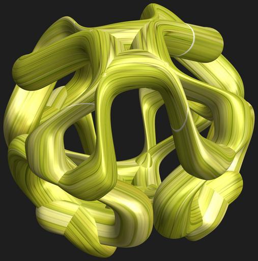 Keywords: mathematica 3d cg parametricplot3d texture torus 輪環 りんかん ドーナツ どーなつ 四芒星 しぼうせい 四光星 しこうせい 四稜星 しりょうせい code program algorithm コード プログラム アルゴリズム bamboo 竹 たけ タケ geometric sculpture geometricsculpture shape geometry sculpture mapping テクスチャ マッピング 模様 もよう abstract 抽象 ちゅうしょう アブストラクト design pattern デザイン パターン graphic グラフィック グラフィクス structure 意匠 構造 symmetry 対称性 たいしょうせい シンメトリー 対称 たいしょう algorithm コード black background indoor a = 5; (* center hole size of a torus *) b = 4; (* tetra-torus *) c = -8; (* distance from the center of rotation *) d = 4; (* number of torus *) h = 2; (* height of a torus *) SetOptions[ParametricPlot3D, PlotRange -> Full, Mesh -> None, Boxed -> False, Axes -> False, PlotPoints -> 400, ImageSize -> 3000, Background -> RGBColor[{30, 30, 30}/255], PlotStyle -> Directive[Specularity[White, 50], Texture[Import["D:/tmp/71.jpg"]]], TextureCoordinateFunction -> ({#4 + #5, #5/Pi} &), Lighting -> "Neutral"]; f[v_] := Sin[2 Sin[Sin[Sin[v]]]]; x = (a - Cos[t] - f[b s]) Cos[s + Pi/(2 b)]; y = (a - Cos[t] - f[b s]) Sin[s + Pi/(2 b)]; z = (a - Sin[t] - h f[b s]) + c; rm = Table[{x, y, z}.RotationMatrix[2 i Pi/d, {1, 0, 0}], {i, d}]; ParametricPlot3D[rm, {t, 0, 2 Pi}, {s, 0, 2 Pi}] (*--- The Texture *) a = 5; (* center hole size of a torus *) b = 4; (* tetra-torus *) c = -8; (* distance from the center of rotation *) d = 4; (* number of torus *) h = 2; (* height of a torus *) SetOptions[ParametricPlot3D, PlotRange -> Full, Mesh -> None, Boxed -> False, Axes -> False, PlotPoints -> 400, ImageSize -> 3000, Background -> RGBColor[{30, 30, 30}/255], PlotStyle -> Directive[Specularity[White, 50], Texture[Import["D:/tmp/71.jpg"]]], TextureCoordinateFunction -> ({#4 + #5, #5/Pi} &), Lighting -> "Neutral"]; f[v_] := Sin[2 Sin[Sin[Sin[v]]]]; x = (a - Cos[t] - f[b s]) Cos[s + Pi/(2 b)]; y = (a - Cos[t] - f[b s]) Sin[s + Pi/(2 b)]; z = (a - Sin[t] - h f[b s]) + c; rm = Table[{x, y, z}.RotationMatrix[2 i Pi/d, {1, 0, 0}], {i, d}]; ParametricPlot3D[rm, {t, 0, 2 Pi}, {s, 0, 2 Pi}] (*--- The Texture *) |
