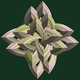 | Keywords: mathematica 3d cg parametricplot3d texture torus code program algorithm プログラム コード アルゴリズム 輪環 りんかん ドーナツ どーなつ 四芒星 しぼうせい geometric sculpture geometricsculpture shape geometry sculpture mapping テクスチャ マッピング 模様 もよう abstract 抽象 ちゅうしょう アブストラクト design pattern デザイン パターン graphic グラフィック グラフィクス structure 意匠 構造 symmetry 対称性 たいしょうせい シンメトリー 対称 たいしょう black background pastel a = 3; (* center hole size *) b = 4; (* tetra-torus *) c = 1; (* distance from the center of rotation *) d = 4; (* number of torus *) h = 3; (* height of a torus *) SetOptions[ParametricPlot3D, PlotRange -> Full, Mesh -> None, Boxed -> False, Axes -> False, PlotPoints -> 400, ImageSize -> 3000, Background -> RGBColor[{20, 50, 30}/255], PlotStyle -> Directive[Specularity[White, 70], Texture[Import["D:/tmp/862.jpg"]]], TextureCoordinateFunction -> ({#4 + #5, #5 / Pi} &), Lighting -> "Neutral"]; f[v_] := TriangleWave[{-1, 1}, v/(2 Pi)]; g[v_] := TriangleWave[{-1, 1}, v/(2 Pi) + 1/4]; x = (a - g[t] - f[b s]) Cos[s] + c; y = (a - g[t] - f[b s]) Sin[s] + c; z = (a - f[t] - h f[b s]); rm = Table[{x, y, z}.RotationMatrix[2 i Pi/d, {0, 0, 1}], {i, d}]; ParametricPlot3D[rm, {t, 0, 2 Pi}, {s, 0, Pi}] (*--- The Texture *) a = 3; (* center hole size *) b = 4; (* tetra-torus *) c = 1; (* distance from the center of rotation *) d = 4; (* number of torus *) h = 3; (* height of a torus *) SetOptions[ParametricPlot3D, PlotRange -> Full, Mesh -> None, Boxed -> False, Axes -> False, PlotPoints -> 400, ImageSize -> 3000, Background -> RGBColor[{20, 50, 30}/255], PlotStyle -> Directive[Specularity[White, 70], Texture[Import["D:/tmp/862.jpg"]]], TextureCoordinateFunction -> ({#4 + #5, #5 / Pi} &), Lighting -> "Neutral"]; f[v_] := TriangleWave[{-1, 1}, v/(2 Pi)]; g[v_] := TriangleWave[{-1, 1}, v/(2 Pi) + 1/4]; x = (a - g[t] - f[b s]) Cos[s] + c; y = (a - g[t] - f[b s]) Sin[s] + c; z = (a - f[t] - h f[b s]); rm = Table[{x, y, z}.RotationMatrix[2 i Pi/d, {0, 0, 1}], {i, d}]; ParametricPlot3D[rm, {t, 0, 2 Pi}, {s, 0, Pi}] (*--- The Texture *) |