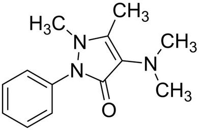 | Keywords: 4-(dimethylamino)-1,5-dimethyl-2-phenyl-1H-pyrazol-3(2H)-one 200.svg validSVG Structure of 4- dimethylamino -1 5-dimethyl-2-phenyl-1H-pyrazol-3 2H -one Own 2014-03-28 Emeldir <span class signature-talk >talk</span> Chemical structure verified https //upload wikimedia org/wikipedia/commons/3/3b/4- 28dimethylamino 29-1 2C5-dimethyl-2-phenyl-1H-pyrazol-3 282H 29-one_200 svg 1S/C13H17N3O/c1-10-12 14 2 3 13 17 16 15 10 4 11-8-6-5-7-9-11/h5-9H 1-4H3 RMMXTBMQSGEXHJ-UHFFFAOYSA-N 58-15-1 Synonyms <small> Dimethylamino phenazone 1 5-Dimethyl-4-dimethylamino-2-phenyl-3-pyrazolone 1 5-dimethyl-4-dimethylamino-2-phenyl-3-pyrazolone 1 5-Dimethyl-4-dimethylamino-2-phenyl-3-pyrazolone 1-Phenyl-2 3-dimethyl-4-dimethylaminopyrazol-5-one 1-Phenyl-2 3-dimethyl-4-dimethylaminopyrazolone-5 1-Phenyl-2 3-dimethyl-4- dimethylamino -5-pyrazolone 1-Phenyl-2 3-dimethyl-4-dimethylaminopyrazol-5-one 1-phenyl-2 3-dimethyl-4-dimethylaminopyrazol-5-one 2 3-Dimethyl-4-dimethylamino-1-phenyl-5-pyrazolone 2 3-Dimethyl-4-dimethylamino-1-phenyl-5-pyrazolone 2 3-dimethyl-4-dimethylamino-1-phenyl-5-pyrazolone 3-keto-1 5-Dimethyl-4-dimethylamino-2-phenyl-2 3-dihydropyrazole 3-keto-1 5-dimethyl-4-dimethylamino-2-phenyl-2 3-dihydropyrazole 3-Keto-1 5-dimethyl-4-dimethylamino-2-phenyl-2 3-dihydropyrazole 3-Pyrazolin-5-one 4- dimethylamino -2 3-dimethyl-1-phenyl- 3H-Pyrazol-3-one 4- dimethylamino -1 2-dihydro-1 5-dimethyl-2-phenyl- 9CI 4- dimethylamino -1 2-dihydro-1 5-dimethyl-2-phenyl-3H-pyrazol-3-one 4- Dimethylamino -1 2-dihydro-1 5-dimethyl-2-phenyl-3H-pyrazol-3-one 4- Dimethylamino -1 5-dimethyl-2-phenyl-3-pyrazolone 4- Dimethylamino antipyrine 4-Dimethyl-13C2-aminoantipyrine 4-Dimethylamino-1 5-dimethyl-2-phenyl-4-pyrazolin-3-one 4-dimethylamino-1 5-dimethyl-2-phenylpyrazol-3-one 4-Dimethylamino-1-phenyl-2 3-dimethylpyrazolone 4-dimethylamino-1-phenyl-2 3-dimethylpyrazolone 4-dimethylamino-2 3-dimethyl-1-phenyl-3-pyrazolin-5-one 4-Dimethylamino-2 3-dimethyl-1-phenyl-3-pyrazolin-5-one 4-dimethylamino-2 3-dimethyl-1-phenyl-5-pyrazolone 4-Dimethylamino-2 3-dimethyl-1-phenyl-5-pyrazolone 4-Dimethylamino-2 3-dimethyl-1-phenylpyrazol-5-one 4-Dimethylaminoantipyrine 4-dimethylaminophenazone 4-Dimethylaminophenazone amidazofen Amidazofen Amidazophen amidazophen Amidazophene Amidazophenum Amidofebrin amidofebrin amidofen Amidofen amidophen Amidophen amidophenazone Amidophenazone amidopyrazoline Amidopyrazoline Amidopyrin amidopyrine Amidopyrine Amidopyrine-Pyramidon Amidopyrinum Aminofenatsoni Aminofenazon Aminofenazona Aminofenazone Aminophenazon Aminophenazone aminophenazone Aminophenazonum Aminopyrin Aminopyrine Aminopyrinum anafebrina Anafebrina Antipyrine 4- dimethylamino - Antipyrine 4- dimethylamino - 8CI Brufaneuxol brufaneuxol CCRIS 2907 dereuma Dereuma dimapyrin Dimapyrin Dimethylamino-analgesine dimethylaminoanalgesine Dimethylaminoanalgesine Dimethylaminoantipyrine dimethylaminoazophene Dimethylaminoazophene Dimethylaminophenazon Dimethylaminophenazone dimethylaminophenazone Dimethylaminophenyldimethylpyrazolin Dimethylaminophenyldimethylpyrazolone dimethylaminophenyldimethylpyrazolone Dipirin dipirin dipyrin Dipyrin Dipyrine dipyrine Eufibron febrinina Febrinina febron Febron HSDB 2135 Hyparon Itamidone itamidone Mamallet-a Mamallet-A mamallet-a netsusarin Netsusarin novamidon Novamidon NSC 4993 Piramidon Pirazon Piridol piridol piromidina Piromidina Polinalin polinalin Pyradone pyradone Pyramidon Pyramidon alcohol pyramidone Pyramidone WLN T5NNVJ A1 BR DN1 1 E1</small> PD-chem Aminophenazone |