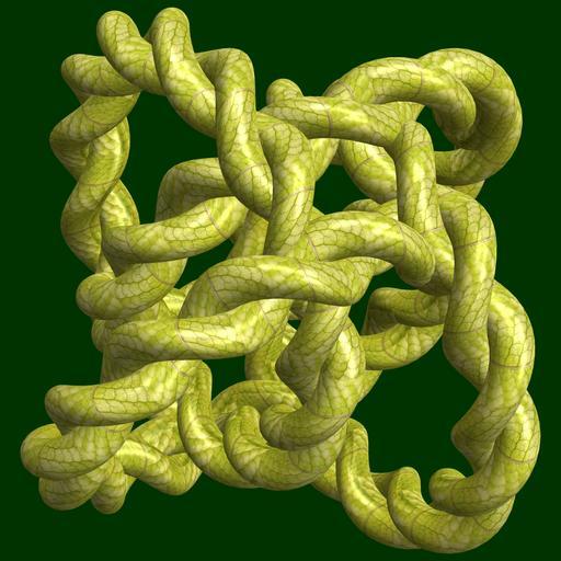Keywords: mathematica 3d cg parametricplot3d texture torus 輪環 りんかん ドーナツ どーなつ プログラム コード code program algorithm コード アルゴリズム geometric sculpture geometricsculpture shape geometry sculpture mapping テクスチャ マッピング 模様 もよう abstract 抽象 ちゅうしょう アブストラクト design pattern デザイン パターン graphic グラフィック グラフィクス structure 意匠 構造 symmetry 対称性 たいしょうせい シンメトリー 対称 たいしょう algorithm ancient indoor SetOptions[ParametricPlot3D, PlotRange -> Full, Mesh -> None, Boxed -> False, Axes -> None, PlotPoints -> 300, ImageSize -> 3000, Background -> Darker[Green, 0.8], PlotStyle -> Directive[Specularity[White, 90], Texture[Import["D:/tmp/71.jpg"]]], TextureCoordinateFunction -> ({#4, #5 b Pi} &), Lighting -> "Neutral"]; a = 10;(* center hole size of a torus *) b = 13; (* number of cross *) c = 3; (* distance from the center of rotation *) d = 4;(* number of torus *) x = (a - Cos[t] + Sin[b s]) Cos[2 s] + c; y = (a - Cos[t] + Sin[b s]) Sin[2 s] + c; z = Cos[b s] + Sin[t] + c; rot = Table[{x, y, z}.RotationMatrix[2 i Pi/d, {1, 0, 0}], {i, d}]; ParametricPlot3D[rot, {t, 0, 2 Pi}, {s, 0, 2 Pi}] (* --- The Texture is this: www.flickr.com/photos/tanaka_juuyoh/5239255695/ *) SetOptions[ParametricPlot3D, PlotRange -> Full, Mesh -> None, Boxed -> False, Axes -> None, PlotPoints -> 300, ImageSize -> 3000, Background -> Darker[Green, 0.8], PlotStyle -> Directive[Specularity[White, 90], Texture[Import["D:/tmp/71.jpg"]]], TextureCoordinateFunction -> ({#4, #5 b Pi} &), Lighting -> "Neutral"]; a = 10;(* center hole size of a torus *) b = 13; (* number of cross *) c = 3; (* distance from the center of rotation *) d = 4;(* number of torus *) x = (a - Cos[t] + Sin[b s]) Cos[2 s] + c; y = (a - Cos[t] + Sin[b s]) Sin[2 s] + c; z = Cos[b s] + Sin[t] + c; rot = Table[{x, y, z}.RotationMatrix[2 i Pi/d, {1, 0, 0}], {i, d}]; ParametricPlot3D[rot, {t, 0, 2 Pi}, {s, 0, 2 Pi}] (* --- The Texture is this: www.flickr.com/photos/tanaka_juuyoh/5239255695/ *) |