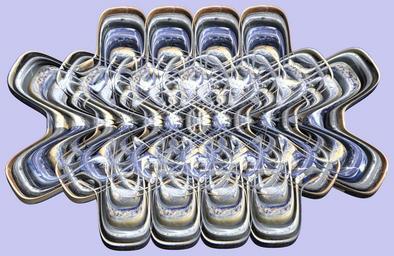 | Keywords: mathematica 3d cg parametricplot3d texture torus code program algorithm プログラム コード アルゴリズム 輪環 りんかん ドーナツ どーなつ トーラス とーらす mapping テクスチャ マッピング 模様 もよう abstract 抽象 ちゅうしょう アブストラクト design pattern デザイン パターン graphic グラフィック グラフィクス structure 意匠 構造 symmetry 対称性 たいしょうせい シンメトリー 対称 たいしょう music brass instrument indoor a = 7; (* center hole size of a torus *) b1 = 6;(* the number of angles *) b2 = 6;(* the number of waves *) c = 4 {0,1,2,3}; (* shift *) d = 4; (* the number of tori *) h1 = 5; (* width of a torus *) h2 = 3; (* width of a torus *) SetOptions[ParametricPlot3D, PlotRange -> Full, Mesh -> None, Boxed -> False, Axes -> None, PlotPoints -> 500, ImageSize -> 3000, Background -> RGBColor[{200, 200, 240}/255], PlotStyle -> Directive[Specularity[White, 70], Texture[Import["D:/tmp/94.jpg"]]], TextureCoordinateFunction -> ({#4, #5 Pi} &), Lighting -> "Neutral"]; f[v_] := Sin[2 Sin[Sin[Sin[v]]]]; x = (a - h1 Cos[t] + h2 f[b1 s]) Cos[s] + c[[i]]; y = (a - h1 Cos[t] + h2 f[b1 s]) Sin[s] + c[[i]]; z = f[b2 t]; sft = Table[{x, y, z}, {i, d}]; ParametricPlot3D[sft, {t, 0, 2 Pi}, {s, 0, 2 Pi}] (*--- The Texture *) a = 7; (* center hole size of a torus *) b1 = 6;(* the number of angles *) b2 = 6;(* the number of waves *) c = 4 {0,1,2,3}; (* shift *) d = 4; (* the number of tori *) h1 = 5; (* width of a torus *) h2 = 3; (* width of a torus *) SetOptions[ParametricPlot3D, PlotRange -> Full, Mesh -> None, Boxed -> False, Axes -> None, PlotPoints -> 500, ImageSize -> 3000, Background -> RGBColor[{200, 200, 240}/255], PlotStyle -> Directive[Specularity[White, 70], Texture[Import["D:/tmp/94.jpg"]]], TextureCoordinateFunction -> ({#4, #5 Pi} &), Lighting -> "Neutral"]; f[v_] := Sin[2 Sin[Sin[Sin[v]]]]; x = (a - h1 Cos[t] + h2 f[b1 s]) Cos[s] + c[[i]]; y = (a - h1 Cos[t] + h2 f[b1 s]) Sin[s] + c[[i]]; z = f[b2 t]; sft = Table[{x, y, z}, {i, d}]; ParametricPlot3D[sft, {t, 0, 2 Pi}, {s, 0, 2 Pi}] (*--- The Texture *) |