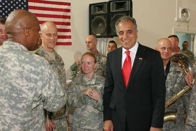 | Keywords: 4th Inf. Div. Band plays 4th of July for Iraqi president, U.S ambassador, M DVIDS32266.jpg en BAGHDAD -- Chief Warrant Officer 3 Otha Wayne Hester far left band master and commander of the 4th Infantry Division Band far left jokes with Dr Zalmay Khalilzad U S Ambassador to Iraq following a band concert held at the U S Embassy in Baghdad July 4 Hester who hails from Hillsborough N C is a 20-year Army and band veteran The 4th Inf Div Band was invited to play for the ceremony which included high-profile guests His Excellency Jalal Talabini president of the Republic of Iraq and General George William Casey Jr commander Multi-National Forces-Iraq Shown with Chief Hester in the photo from left to right standing behind the Ambassador are band members Staff Sgt Scott Magnuson from Astoria Ore Sgt Kayla Gaddis from Hoyt Lakes Minn ; in the rear are Staff Sgt Troy Hascall who hails from Atlantic Iowa and Spc Michael Mendoza from El Paso Texas; to the ambassador's right is Master Sgt Stephen Mohacey from San Antonio Texas Photo courtesy of U S Navy 2006-07-10 Sgt 1st Class Mary Mott https //www dvidshub net/image/32266 32266 2006-10-25 15 20 BAGHDAD IQ PD-USGov People of El Paso Texas Images from DoD uploaded by Fæ |