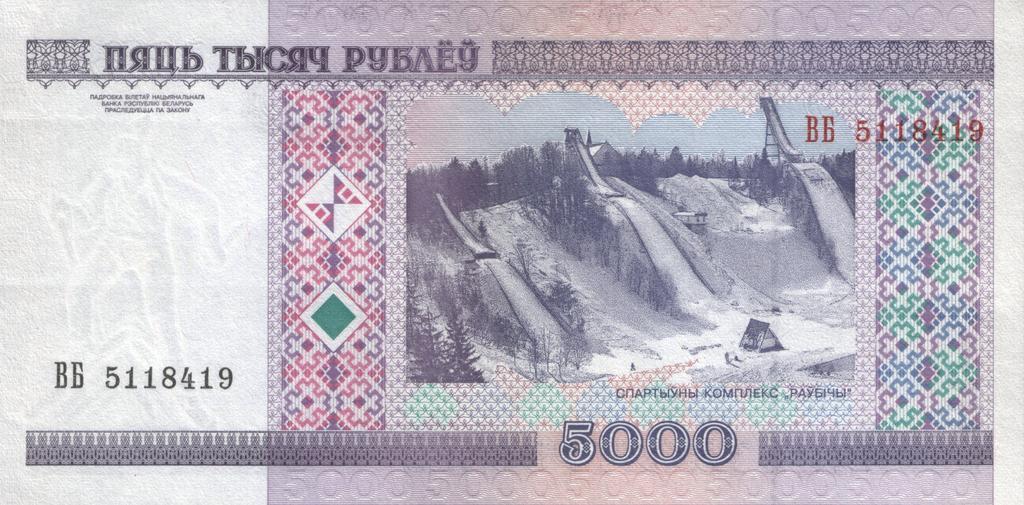 | Keywords: 5000-rubles-Belarus-2000-b.jpg 5000 ублей Бело уссии 2000 5000 roubles of Belarus 2000 own scan 2000 National Bank of Republic of Belarus ациональный банк Республики Бела усь ацыянальны Банк Рэспублiкi Бела усь PD-BY-exempt banknotes Banknotes of Belarus 2000 Sport Complex in Raŭbičy Banknotes with a face value of 5000 Purple banknotes Sports venues on banknotes |