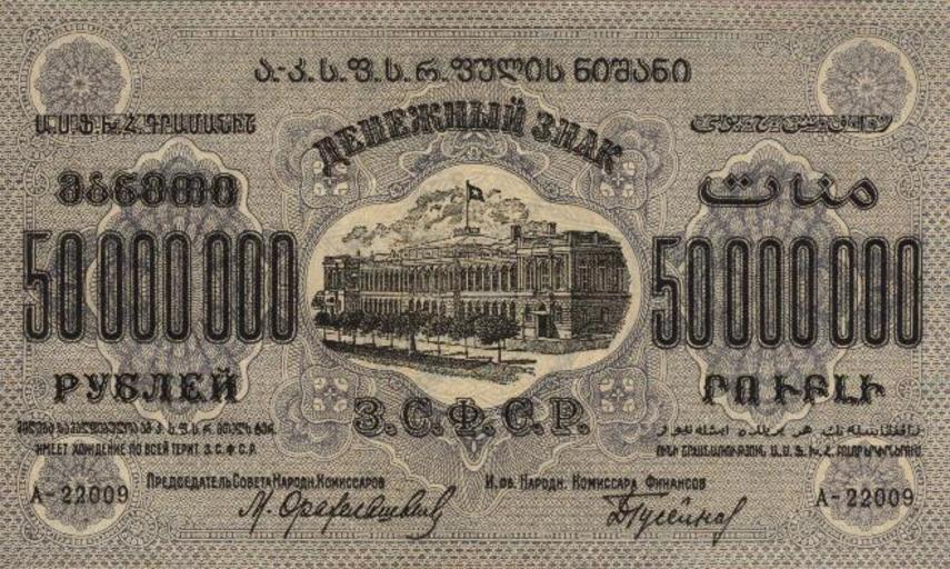 | Keywords: 50 000 000 рублей 1924 года. Аверс.jpg 50 000 000 ублей 1924 года ЗСФСР Аве с казначейство ЗСФСР 1924 год http //oldcoffer narod ru/ PD-old-auto 1924 PD-GE-exempt banknotes PD-AM-exempt banknotes PD-AZ-exempt banknotes currency Original upload log ru wikipedia ftcg page ru wikipedia 50_000_000_ D1 80 D1 83 D0 B1 D0 BB D0 B5 D0 B9_1924_ D0 B3 D0 BE D0 B4 D0 B0 _ D0 90 D0 B2 D0 B5 D1 80 D1 81 jpg wikitable - 17 14 17 February 2011 660 × 395 110 459 bytes Knyaz-1988 w ru <nowiki> Изоб ажение Описание 50 000 000 ублей 1924 года ЗСФСР Аве с Авто казначейство ЗСФСР В емя создания </nowiki> Banknotes of the Transcaucasian Socialist Federative Soviet Republic Banknotes with a face value of 50000000 |