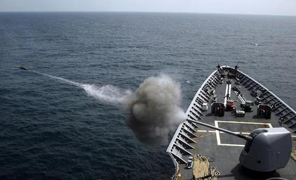 Keywords: 5450841935 41a2459189 o.jpg en The guided-missile cruiser USS Vella Gulf CG 72 fires a 5-inch MK-45 Mod 2 light-weight gun during a live fire exercise during Joint Task Force Exercise JTFEX 08-4 as a part of the Iwo Jima Expeditionary Strike Group 2008-07-27 http //www flickr com/photos/usnavy/5450841935/in/photostream/ U S Navy photo by Mass Communication Specialist Seaman Chad R Erdmann PD-USN 5 /54 caliber Mark 45 gun firing Uploaded with UploadWizard USS Vella Gulf CG-72 Iwo Jima Expeditionary Strike Group