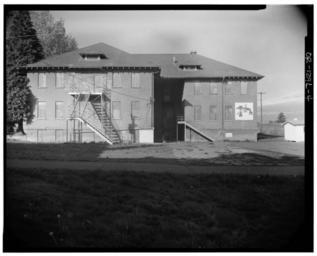 | Keywords: 5495 Chugath Street - east side elevation - Chemawa Indian School - Salem Oregon.jpg 92001333 en Chemawa Indian School Hawley Hall 5495 Chugach Street Northeast Salem Marion County OR CALL NUMBER HABS ORE 24-SAL 1L- CREATOR Historic American Buildings Survey creator NOTE Survey number HABS OR-129-L DIGID http //hdl loc gov/loc pnp/hhh or0051 LOC card 5495 Chugach St N E Brick with concrete and wooden trim rectangular with rear ell 90' five-bay front x 48' wing 32' x 54' connector 13' x 14' two-and-a-half stories hip roof with exposed rafters at eaves hip dormers three-bay hip-roof entrance porch with paired columns; dormitory pressed metal ceilings Built 1924; alterations to provide home economics classrooms n d; second floor altered for science lab 1966; demolished 1978 6 ext photos 1977 3 int photos 1977 Also see Chemawa Indian School OR-129 Card prepared 1979 Author information not found but presumed to be Steve Viale Library of Congress Historic American Buildings Survey 1977 OR-129-L Historic American Buildings Survey photographs of the Chemawa Indian School Former buildings in Oregon Chemawa 1977 in Oregon Chemawa Black and white photographs of Oregon Chemawa |
