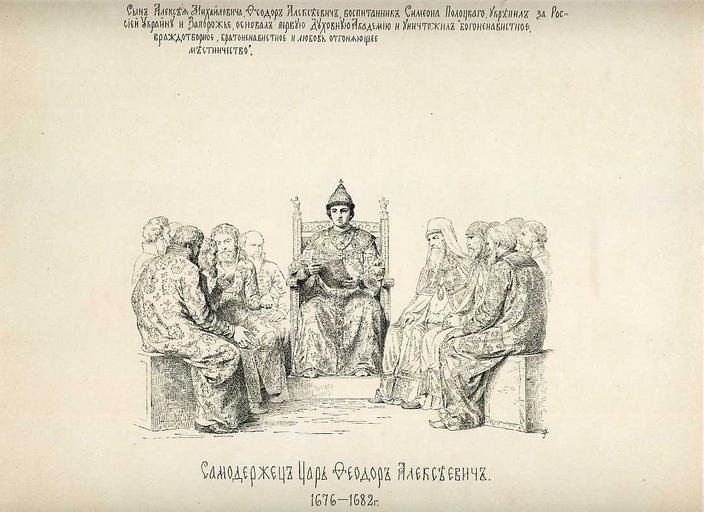 | Keywords: 56 History of the Russian state in the image of its sovereign rulers.jpg ru Самоде жец Ца ь Феодо Алексеевич 1676-1682 г <br>Сын Алексея ихайловича Феодо Алексеевич воспитанник Симеона Полоцкого ук епил за Россией Ук аину и Запо ожье основал пе вую Духовную Академию и уничтожил богоненавистное в аждотво ное б атоненавистное и любовь отгоняющее местничество full 56 History of the Russian state in the image of its sovereign rulers - fragment jpg Feodor III of Russia | ||||
