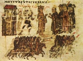 ΡΠ΄ΠΎΠΆΠ½ΠΈΠΊ Π‘ΠΎΡΠΈΡ 1962 Scanned from book Miniatures from the Manasses Chronicle Ivan Duichev Bulgarski hudojnik Publishing house Sofia 1962 Original 14 century Original Constantine Manasses PD-Art PD-Art-100 Constantine Manasses Chronicle Leon VI |