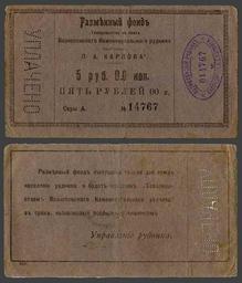 | Keywords: Вознесенский рудник. 5 рублей (2).jpg Юзовка Разменный денежный знак това ищества на паях Вознесенского каменноугольного удника наследниц П А Ка пова 5 ублей http //forum gp dn ua/viewtopic php f 28 t 952 sid a2c8198a8c0277c6542008ec0ed5a590 Выпуск собственных бон нужно видимо отнести к началу 1918 года Author PD-RusEmpire Money of Donetsk Moneys uploaded by Andrew Butko from various sources Donetsk in the unidentified decade Historical non-photos images of Donetsk by alphabet Images from forum gp dn ua Banknotes with a face value of 5 |