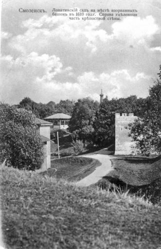 | Keywords: Лопатинский сад 5.jpg en Lopatinsky garden in Smolensk View from the Royal Bastion Visible fragment of the Smolensk fortress wall in the background behind the trees - a monument to the heroes of the War of 1812 ru Лопатинский сад в Смоленске Вид с ко олевского бастиона Виден ф агмент Смоленской к епостной стены на заднем плане за де евьями - памятник ге оям Отечественной войны 1812 года О игинальная отк ытка е установлены before 1917 года PD-RusEmpire 20th-century postcards Postcards of Smolensk Lopatinsky garden |