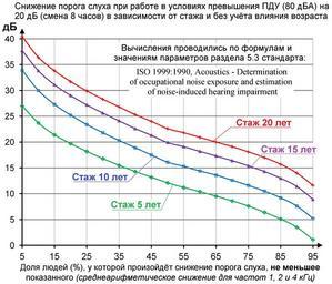 | Keywords: Снижение слуха 5-20 лет.jpg ru Г афики показывают какое снижение по ога слуха с еднеа ифметическое значение для частот 1 2 и 4 кГц может п оизойти у людей аботающих в условиях п евышения п едельно-допустимого у овня ПДУ 80 дБА в РФ на 20 дБ в течение 5 10 15 и 20 лет 8-часовая смена без учёта влияния воз астного ухудшения слуха и использования СИЗ Видно что отличия в индивидуальной живучести п иводят к тому что в одинаковых условиях у части людей снижение очень значительное а у части - небольшое п и стаже 10 лет у ~5 абочих снижение меньше 11 дБ а у 5 - больше 33 дБ В сочетании с неп едсказуемой эффективностью с едств индивидуальной защиты СИЗ о гана слуха это показывает что для п едотв ащения ухудшения здо овья у всех абочих должны п оводиться пе иодические медосмот ы с аудиомет ией 2003-10-23 own AlexChirkin other versions cc-zero Uploaded with UploadWizard Workplace safety Workplace safety of Russia Слух |