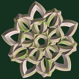 | Keywords: mathematica 3d cg parametricplot3d texture torus code program algorithm プログラム コード アルゴリズム 輪環 りんかん ドーナツ どーなつ 六芒星 ろくぼうせい geometric sculpture geometricsculpture shape geometry sculpture mapping テクスチャ マッピング 模様 もよう abstract 抽象 ちゅうしょう アブストラクト design pattern デザイン パターン graphic グラフィック グラフィクス structure 意匠 構造 symmetry 対称性 たいしょうせい シンメトリー 対称 たいしょう black background tangle a = 4; (* center hole size *) b = 6; (* hexa-torus *) c = 2; (* distance from the center of rotation *) d = 5; (* number of torus *) h = 0; (* height of a torus *) SetOptions[ParametricPlot3D, PlotRange -> Full, Mesh -> None, Boxed -> False, Axes -> False, PlotPoints -> 400, ImageSize -> 3000, Background -> RGBColor[{20, 50, 30}/255], PlotStyle -> Directive[Specularity[White, 40], Texture[Import["D:/tmp/862.jpg"]]], TextureCoordinateFunction -> ({#4 + #5, #5 / Pi} &), Lighting -> "Neutral"]; f[v_] := TriangleWave[{-1, 1}, v/(2 Pi)]; g[v_] := TriangleWave[{-1, 1}, v/(2 Pi) + 1/4]; x = (a - g[t] - f[b s]) Cos[s] + c; y = (a - g[t] - f[b s]) Sin[s] + c; z = (a - f[t] - h f[b s]); rm = Table[{x, y, z}.RotationMatrix[2 i Pi/d, {0, 0, 1}], {i, d}]; ParametricPlot3D[rm, {t, 0, 2 Pi}, {s, 0, Pi}] (*--- The Texture *) a = 4; (* center hole size *) b = 6; (* hexa-torus *) c = 2; (* distance from the center of rotation *) d = 5; (* number of torus *) h = 0; (* height of a torus *) SetOptions[ParametricPlot3D, PlotRange -> Full, Mesh -> None, Boxed -> False, Axes -> False, PlotPoints -> 400, ImageSize -> 3000, Background -> RGBColor[{20, 50, 30}/255], PlotStyle -> Directive[Specularity[White, 40], Texture[Import["D:/tmp/862.jpg"]]], TextureCoordinateFunction -> ({#4 + #5, #5 / Pi} &), Lighting -> "Neutral"]; f[v_] := TriangleWave[{-1, 1}, v/(2 Pi)]; g[v_] := TriangleWave[{-1, 1}, v/(2 Pi) + 1/4]; x = (a - g[t] - f[b s]) Cos[s] + c; y = (a - g[t] - f[b s]) Sin[s] + c; z = (a - f[t] - h f[b s]); rm = Table[{x, y, z}.RotationMatrix[2 i Pi/d, {0, 0, 1}], {i, d}]; ParametricPlot3D[rm, {t, 0, 2 Pi}, {s, 0, Pi}] (*--- The Texture *) |