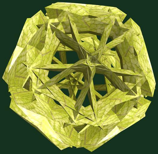 Keywords: mathematica 3d cg parametricplot3d texture torus code program algorithm プログラム コード アルゴリズム 輪環 りんかん ドーナツ どーなつ 八芒星 はちぼうせい geometric sculpture geometricsculpture shape geometry sculpture mapping テクスチャ マッピング 模様 もよう abstract 抽象 ちゅうしょう アブストラクト design pattern デザイン パターン graphic グラフィック グラフィクス structure 意匠 構造 symmetry 対称性 たいしょうせい シンメトリー 対称 たいしょう outdoor foliage leaf plant black background a = 6; (* center hole size *) b = 8; (* octa-torus *) c = -8; (* distance from the center of rotation *) d = 5; (* number of torus *) h = 3; (* height of a torus *) SetOptions[ParametricPlot3D, PlotRange -> Full, Mesh -> None, Boxed -> False, Axes -> False, PlotPoints -> 400, ImageSize -> 3000, Background -> RGBColor[{20, 50, 30}/255], PlotStyle -> Directive[Specularity[White, 30], Texture[Import["D:/tmp/71.jpg"]]], TextureCoordinateFunction -> ({#4, #5 Pi} &), Lighting -> "Neutral"]; f[v_] := TriangleWave[{-1, 1}, v/(2 Pi)]; g[v_] := TriangleWave[{-1, 1}, v/(2 Pi) + 1/4]; x = (a - g[t] - f[b s]) Cos[s + Pi/(2 b)]; y = (a - g[t] - f[b s]) Sin[s + Pi/(2 b)]; z = (a - f[t] - h f[b s]) + c; rm = Table[{x, y, z}.RotationMatrix[2 i Pi/d, {1, 1, 0}], {i, d}]; ParametricPlot3D[rm, {t, 0, 2 Pi}, {s, 0, Pi}] (*--- The Texture *) a = 6; (* center hole size *) b = 8; (* octa-torus *) c = -8; (* distance from the center of rotation *) d = 5; (* number of torus *) h = 3; (* height of a torus *) SetOptions[ParametricPlot3D, PlotRange -> Full, Mesh -> None, Boxed -> False, Axes -> False, PlotPoints -> 400, ImageSize -> 3000, Background -> RGBColor[{20, 50, 30}/255], PlotStyle -> Directive[Specularity[White, 30], Texture[Import["D:/tmp/71.jpg"]]], TextureCoordinateFunction -> ({#4, #5 Pi} &), Lighting -> "Neutral"]; f[v_] := TriangleWave[{-1, 1}, v/(2 Pi)]; g[v_] := TriangleWave[{-1, 1}, v/(2 Pi) + 1/4]; x = (a - g[t] - f[b s]) Cos[s + Pi/(2 b)]; y = (a - g[t] - f[b s]) Sin[s + Pi/(2 b)]; z = (a - f[t] - h f[b s]) + c; rm = Table[{x, y, z}.RotationMatrix[2 i Pi/d, {1, 1, 0}], {i, d}]; ParametricPlot3D[rm, {t, 0, 2 Pi}, {s, 0, Pi}] (*--- The Texture *) |