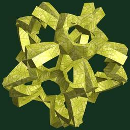 | Keywords: mathematica 3d cg parametricplot3d texture torus code program algorithm プログラム コード アルゴリズム 輪環 りんかん ドーナツ どーなつ 八芒星 はちぼうせい geometric sculpture geometricsculpture shape geometry sculpture mapping テクスチャ マッピング 模様 もよう abstract 抽象 ちゅうしょう アブストラクト design pattern デザイン パターン graphic グラフィック グラフィクス structure 意匠 構造 symmetry 対称性 たいしょうせい シンメトリー 対称 たいしょう plant foliage leaf organic pattern tree black background outdoor a = 8; (* center hole size *) b = 8; (* octa-torus *) c = -6; (* distance from the center of rotation *) d = 5; (* number of torus *) h = 1; (* height of a torus *) SetOptions[ParametricPlot3D, PlotRange -> Full, Mesh -> None, Boxed -> False, Axes -> False, PlotPoints -> 400, ImageSize -> 3000, Background -> RGBColor[{20, 50, 30}/255], PlotStyle -> Directive[Specularity[White, 30], Texture[Import["D:/tmp/71.jpg"]]], TextureCoordinateFunction -> ({#4, #5 Pi} &), Lighting -> "Neutral"]; f[v_] := TriangleWave[{-1, 1}, v/(2 Pi)]; g[v_] := TriangleWave[{-1, 1}, v/(2 Pi) + 1/4]; x = (a - g[t] - f[b s]) Cos[s + Pi/(2 b)]; y = (a - g[t] - f[b s]) Sin[s + Pi/(2 b)]; z = (a - f[t] - h f[b s]) + c; rm = Table[{x, y, z}.RotationMatrix[2 i Pi/d, {1, 1, 0}], {i, d}]; ParametricPlot3D[rm, {t, 0, 2 Pi}, {s, 0, Pi}] (*--- The Texture *) a = 8; (* center hole size *) b = 8; (* octa-torus *) c = -6; (* distance from the center of rotation *) d = 5; (* number of torus *) h = 1; (* height of a torus *) SetOptions[ParametricPlot3D, PlotRange -> Full, Mesh -> None, Boxed -> False, Axes -> False, PlotPoints -> 400, ImageSize -> 3000, Background -> RGBColor[{20, 50, 30}/255], PlotStyle -> Directive[Specularity[White, 30], Texture[Import["D:/tmp/71.jpg"]]], TextureCoordinateFunction -> ({#4, #5 Pi} &), Lighting -> "Neutral"]; f[v_] := TriangleWave[{-1, 1}, v/(2 Pi)]; g[v_] := TriangleWave[{-1, 1}, v/(2 Pi) + 1/4]; x = (a - g[t] - f[b s]) Cos[s + Pi/(2 b)]; y = (a - g[t] - f[b s]) Sin[s + Pi/(2 b)]; z = (a - f[t] - h f[b s]) + c; rm = Table[{x, y, z}.RotationMatrix[2 i Pi/d, {1, 1, 0}], {i, d}]; ParametricPlot3D[rm, {t, 0, 2 Pi}, {s, 0, Pi}] (*--- The Texture *) |