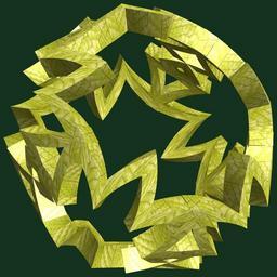 | Keywords: mathematica 3d cg parametricplot3d texture torus code program algorithm プログラム コード アルゴリズム 輪環 りんかん ドーナツ どーなつ 八芒星 はちぼうせい geometric sculpture geometricsculpture shape geometry sculpture mapping テクスチャ マッピング 模様 もよう abstract 抽象 ちゅうしょう アブストラクト design pattern デザイン パターン graphic グラフィック グラフィクス structure 意匠 構造 symmetry 対称性 たいしょうせい シンメトリー 対称 たいしょう plant leaf foliage outdoor a = 4; (* center hole size *) b = 8; (* octa-torus *) c = -10; (* distance from the center of rotation *) d = 5; (* number of torus *) h = 1; (* height of a torus *) SetOptions[ParametricPlot3D, PlotRange -> Full, Mesh -> None, Boxed -> False, Axes -> False, PlotPoints -> 400, ImageSize -> 3000, Background -> RGBColor[{20, 50, 30}/255], PlotStyle -> Directive[Specularity[White, 30], Texture[Import["D:/tmp/71.jpg"]]], TextureCoordinateFunction -> ({#4, #5 Pi} &), Lighting -> "Neutral"]; f[v_] := TriangleWave[{-1, 1}, v/(2 Pi)]; g[v_] := TriangleWave[{-1, 1}, v/(2 Pi) + 1/4]; x = (a - g[t] - f[b s]) Cos[s + Pi/(2 b)]; y = (a - g[t] - f[b s]) Sin[s + Pi/(2 b)]; z = (a - f[t] - h f[b s]) + c; rm = Table[{x, y, z}.RotationMatrix[2 i Pi/d, {1, 1, 0}], {i, d}]; ParametricPlot3D[rm, {t, 0, 2 Pi}, {s, 0, Pi}] (*--- The Texture *) a = 4; (* center hole size *) b = 8; (* octa-torus *) c = -10; (* distance from the center of rotation *) d = 5; (* number of torus *) h = 1; (* height of a torus *) SetOptions[ParametricPlot3D, PlotRange -> Full, Mesh -> None, Boxed -> False, Axes -> False, PlotPoints -> 400, ImageSize -> 3000, Background -> RGBColor[{20, 50, 30}/255], PlotStyle -> Directive[Specularity[White, 30], Texture[Import["D:/tmp/71.jpg"]]], TextureCoordinateFunction -> ({#4, #5 Pi} &), Lighting -> "Neutral"]; f[v_] := TriangleWave[{-1, 1}, v/(2 Pi)]; g[v_] := TriangleWave[{-1, 1}, v/(2 Pi) + 1/4]; x = (a - g[t] - f[b s]) Cos[s + Pi/(2 b)]; y = (a - g[t] - f[b s]) Sin[s + Pi/(2 b)]; z = (a - f[t] - h f[b s]) + c; rm = Table[{x, y, z}.RotationMatrix[2 i Pi/d, {1, 1, 0}], {i, d}]; ParametricPlot3D[rm, {t, 0, 2 Pi}, {s, 0, Pi}] (*--- The Texture *) |