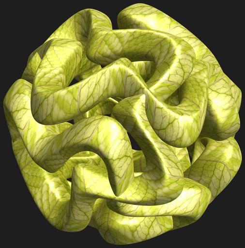 Keywords: mathematica 3d cg parametricplot3d texture torus 輪環 りんかん ドーナツ どーなつ 五芒星 ごぼうせい 五光星 ごこうせい 五稜星 ごりょうせい code program algorithm コード プログラム アルゴリズム pentagram geometric sculpture geometricsculpture shape geometry sculpture mapping テクスチャ マッピング 模様 もよう abstract 抽象 ちゅうしょう アブストラクト design pattern デザイン パターン graphic グラフィック グラフィクス structure 意匠 構造 symmetry 対称性 たいしょうせい シンメトリー 対称 たいしょう algorithm コード indoor vegetable food black background a = 5; (* center hole size of a torus *) b = 5; (* penta-torus *) c = -8; (* distance from the center of rotation *) d = 5; (* number of torus *) h = 1; (* height of a torus *) SetOptions[ParametricPlot3D, PlotRange -> Full, Mesh -> None, Boxed -> False, Axes -> False, PlotPoints -> 400, ImageSize -> 3000, Background -> RGBColor[{30, 30, 30}/255], PlotStyle -> Directive[Specularity[White, 30], Texture[Import["D:/tmp/71.jpg"]]], TextureCoordinateFunction -> ({#4, #5 b Pi} &), Lighting -> "Neutral"]; f[v_] := Sin[2 Sin[Sin[Sin[v]]]]; x = (a - Cos[t] - Sin[b s]) Cos[s + Pi/b]; y = (a - Cos[t] - Sin[b s]) Sin[s + Pi/b]; z = (a - f[t] - h Sin[b s]) + c; rm = Table[{x, y, z}.RotationMatrix[2 i Pi/d, {1, 0, 0}], {i, d}]; ParametricPlot3D[rm, {t, 0, 2 Pi}, {s, 0, 2 Pi}] (*--- The Texture *) a = 5; (* center hole size of a torus *) b = 5; (* penta-torus *) c = -8; (* distance from the center of rotation *) d = 5; (* number of torus *) h = 1; (* height of a torus *) SetOptions[ParametricPlot3D, PlotRange -> Full, Mesh -> None, Boxed -> False, Axes -> False, PlotPoints -> 400, ImageSize -> 3000, Background -> RGBColor[{30, 30, 30}/255], PlotStyle -> Directive[Specularity[White, 30], Texture[Import["D:/tmp/71.jpg"]]], TextureCoordinateFunction -> ({#4, #5 b Pi} &), Lighting -> "Neutral"]; f[v_] := Sin[2 Sin[Sin[Sin[v]]]]; x = (a - Cos[t] - Sin[b s]) Cos[s + Pi/b]; y = (a - Cos[t] - Sin[b s]) Sin[s + Pi/b]; z = (a - f[t] - h Sin[b s]) + c; rm = Table[{x, y, z}.RotationMatrix[2 i Pi/d, {1, 0, 0}], {i, d}]; ParametricPlot3D[rm, {t, 0, 2 Pi}, {s, 0, 2 Pi}] (*--- The Texture *) |