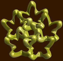 | Keywords: mathematica 3d cg parametricplot3d texture torus 輪環 りんかん ドーナツ どーなつ 五芒星 ごぼうせい 五光星 ごこうせい 五稜星 ごりょうせい code program algorithm コード プログラム アルゴリズム pentagram geometric sculpture geometricsculpture shape geometry sculpture mapping テクスチャ マッピング 模様 もよう abstract 抽象 ちゅうしょう アブストラクト design pattern デザイン パターン graphic グラフィック グラフィクス structure 意匠 構造 symmetry 対称性 たいしょうせい シンメトリー 対称 たいしょう algorithm コード indoor black background organic pattern bright a = 4; (* center hole size *) b = 5; (* penta-torus *) c = 4; (* distance from the center of rotation *) d = 5; (* number of torus *) h = 2; (* height of a torus *) SetOptions[ParametricPlot3D, PlotRange -> Full, Mesh -> None, Boxed -> False, Axes -> False, PlotPoints -> 400, ImageSize -> 3000, Background -> Darker[Orange, 0.8], PlotStyle -> Directive[Specularity[White, 30], Texture[Import["D:/tmp/71.jpg"]]], TextureCoordinateFunction -> ({#4 + #5, #5 / Pi} &), Lighting -> "Neutral"]; f[v_] := Sin[2 Sin[Sin[Sin[v]]]]; x = (a - Cos[t] - f[b s]) Cos[s] + c; y = (a - Cos[t] - Sin[b s]) Sin[s] + c; z = (a - Sin[t] - h Sin[b s]); rot = Table[{x, y, z}.RotationMatrix[2 i Pi/d, {0, 0, 1}], {i, d}]; ParametricPlot3D[rot, {t, 0, 2 Pi}, {s, 0, 2 Pi}] (*--- The Texture is this: www.flickr.com/photos/tanaka_juuyoh/5239255695/ *) a = 4; (* center hole size *) b = 5; (* penta-torus *) c = 4; (* distance from the center of rotation *) d = 5; (* number of torus *) h = 2; (* height of a torus *) SetOptions[ParametricPlot3D, PlotRange -> Full, Mesh -> None, Boxed -> False, Axes -> False, PlotPoints -> 400, ImageSize -> 3000, Background -> Darker[Orange, 0.8], PlotStyle -> Directive[Specularity[White, 30], Texture[Import["D:/tmp/71.jpg"]]], TextureCoordinateFunction -> ({#4 + #5, #5 / Pi} &), Lighting -> "Neutral"]; f[v_] := Sin[2 Sin[Sin[Sin[v]]]]; x = (a - Cos[t] - f[b s]) Cos[s] + c; y = (a - Cos[t] - Sin[b s]) Sin[s] + c; z = (a - Sin[t] - h Sin[b s]); rot = Table[{x, y, z}.RotationMatrix[2 i Pi/d, {0, 0, 1}], {i, d}]; ParametricPlot3D[rot, {t, 0, 2 Pi}, {s, 0, 2 Pi}] (*--- The Texture is this: www.flickr.com/photos/tanaka_juuyoh/5239255695/ *) |