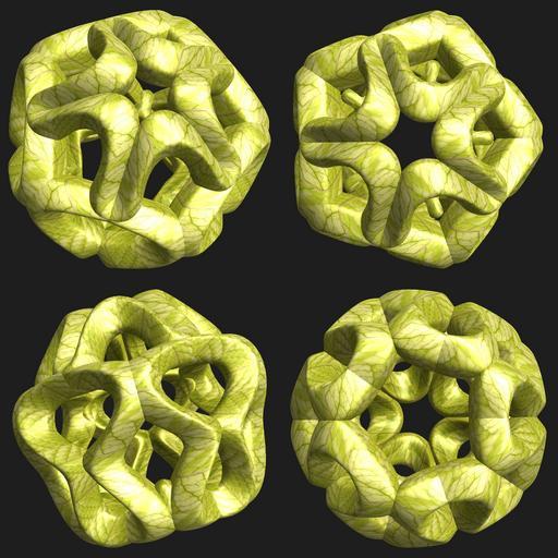 Keywords: mathematica 3d cg parametricplot3d texture torus 輪環 りんかん ドーナツ どーなつ 五芒星 ごぼうせい 五光星 ごこうせい 五稜星 ごりょうせい code program algorithm コード プログラム アルゴリズム pentagram geometric sculpture geometricsculpture shape geometry sculpture mapping テクスチャ マッピング 模様 もよう abstract 抽象 ちゅうしょう アブストラクト design pattern デザイン パターン graphic グラフィック グラフィクス structure 意匠 構造 symmetry 対称性 たいしょうせい シンメトリー 対称 たいしょう algorithm コード indoor black background a = 5; (* center hole size of a torus *) b = 5; (* penta-torus *) c = -8; (* distance from the center of rotation *) d = 5; (* number of torus *) h = 1; (* height of a torus *) SetOptions[ParametricPlot3D, PlotRange -> Full, Mesh -> None, Boxed -> False, Axes -> False, PlotPoints -> 400, ImageSize -> 1600, Background -> RGBColor[{30, 30, 30}/255], PlotStyle -> Directive[Specularity[White, 30], Texture[Import["D:/tmp/71.jpg"]]], TextureCoordinateFunction -> ({#4, #5 b Pi} &), Lighting -> "Neutral"]; f[v_] := Sin[2 Sin[Sin[Sin[v]]]]; x = (a - Cos[t] - Sin[b s]) Cos[s + Pi/(2 b)]; y = (a - Cos[t] - Sin[b s]) Sin[s + Pi/(2 b)]; z = (a - f[t] - h Sin[b s]) + c; rm = Table[{x, y, z}.RotationMatrix[2 i Pi/d, {1, 0, 0}], {i, d}]; ParametricPlot3D[rm, {t, 0, 2 Pi}, {s, 0, 2 Pi}] (*--- The Texture *) a = 5; (* center hole size of a torus *) b = 5; (* penta-torus *) c = -8; (* distance from the center of rotation *) d = 5; (* number of torus *) h = 1; (* height of a torus *) SetOptions[ParametricPlot3D, PlotRange -> Full, Mesh -> None, Boxed -> False, Axes -> False, PlotPoints -> 400, ImageSize -> 1600, Background -> RGBColor[{30, 30, 30}/255], PlotStyle -> Directive[Specularity[White, 30], Texture[Import["D:/tmp/71.jpg"]]], TextureCoordinateFunction -> ({#4, #5 b Pi} &), Lighting -> "Neutral"]; f[v_] := Sin[2 Sin[Sin[Sin[v]]]]; x = (a - Cos[t] - Sin[b s]) Cos[s + Pi/(2 b)]; y = (a - Cos[t] - Sin[b s]) Sin[s + Pi/(2 b)]; z = (a - f[t] - h Sin[b s]) + c; rm = Table[{x, y, z}.RotationMatrix[2 i Pi/d, {1, 0, 0}], {i, d}]; ParametricPlot3D[rm, {t, 0, 2 Pi}, {s, 0, 2 Pi}] (*--- The Texture *) |
