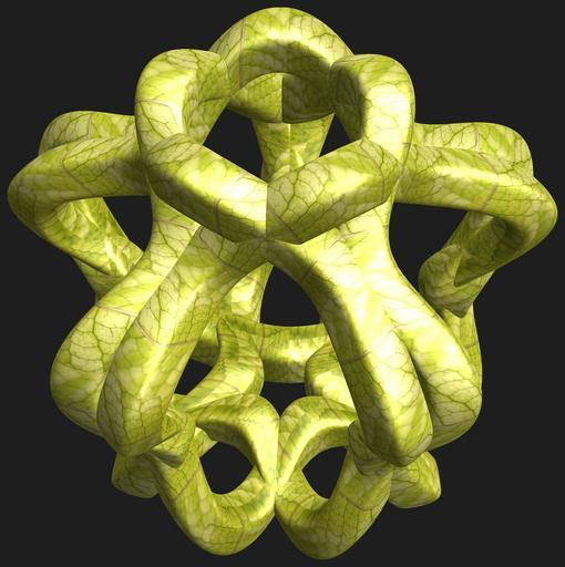 Keywords: mathematica 3d cg parametricplot3d texture torus 輪環 りんかん ドーナツ どーなつ 五芒星 ごぼうせい 五光星 ごこうせい 五稜星 ごりょうせい code program algorithm コード プログラム アルゴリズム pentagram geometric sculpture geometricsculpture shape geometry sculpture mapping テクスチャ マッピング 模様 もよう abstract 抽象 ちゅうしょう アブストラクト design pattern デザイン パターン graphic グラフィック グラフィクス structure 意匠 構造 symmetry 対称性 たいしょうせい シンメトリー 対称 たいしょう algorithm コード black background indoor food a = 8; (* center hole size of a torus *) b = 5; (* penta-torus *) c = -5; (* distance from the center of rotation *) d = 5; (* number of torus *) h = 1; (* height of a torus *) SetOptions[ParametricPlot3D, PlotRange -> Full, Mesh -> None, Boxed -> False, Axes -> False, PlotPoints -> 400, ImageSize -> 3000, Background -> RGBColor[{30, 30, 30}/255], PlotStyle -> Directive[Specularity[White, 30], Texture[Import["D:/tmp/71.jpg"]]], TextureCoordinateFunction -> ({#4, #5 b Pi} &), Lighting -> "Neutral"]; f[v_] := Sin[2 Sin[Sin[Sin[v]]]]; x = (a - Cos[t] - Sin[b s]) Cos[s + Pi/(2 b)]; y = (a - Cos[t] - Sin[b s]) Sin[s + Pi/(2 b)]; z = (a - f[t] - h Sin[b s]) + c; rm = Table[{x, y, z}.RotationMatrix[2 i Pi/d, {1, 0, 0}], {i, d}]; ParametricPlot3D[rm, {t, 0, 2 Pi}, {s, 0, 2 Pi}] (*--- The Texture *) a = 8; (* center hole size of a torus *) b = 5; (* penta-torus *) c = -5; (* distance from the center of rotation *) d = 5; (* number of torus *) h = 1; (* height of a torus *) SetOptions[ParametricPlot3D, PlotRange -> Full, Mesh -> None, Boxed -> False, Axes -> False, PlotPoints -> 400, ImageSize -> 3000, Background -> RGBColor[{30, 30, 30}/255], PlotStyle -> Directive[Specularity[White, 30], Texture[Import["D:/tmp/71.jpg"]]], TextureCoordinateFunction -> ({#4, #5 b Pi} &), Lighting -> "Neutral"]; f[v_] := Sin[2 Sin[Sin[Sin[v]]]]; x = (a - Cos[t] - Sin[b s]) Cos[s + Pi/(2 b)]; y = (a - Cos[t] - Sin[b s]) Sin[s + Pi/(2 b)]; z = (a - f[t] - h Sin[b s]) + c; rm = Table[{x, y, z}.RotationMatrix[2 i Pi/d, {1, 0, 0}], {i, d}]; ParametricPlot3D[rm, {t, 0, 2 Pi}, {s, 0, 2 Pi}] (*--- The Texture *) |